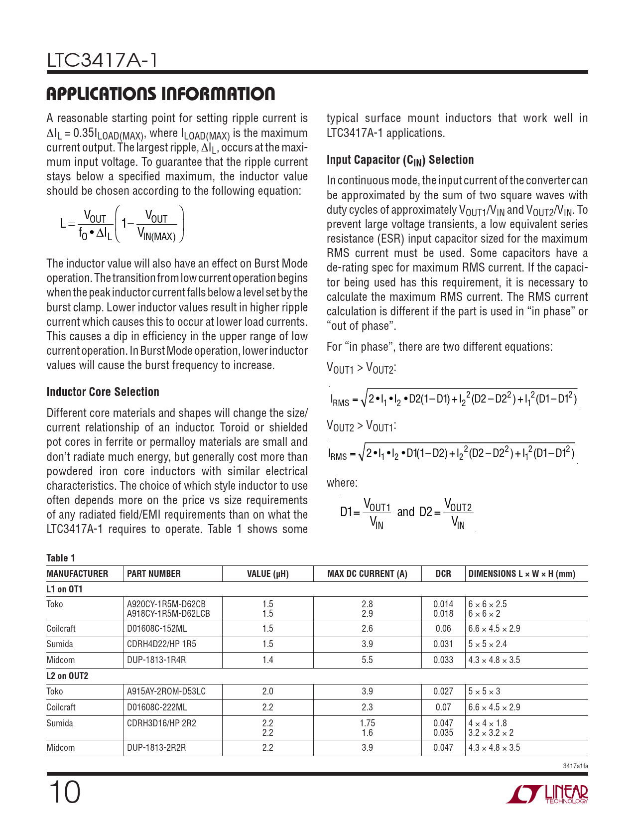 A reasonable starting point for setting ripple current is typical surface mount inductors that work well in ΔIL = 0.35ILOAD(MAX), where ILOAD(MAX) is the maximum LTC3417A-1 applications. current output. The largest ripple, ΔIL, occurs at the maxi- mum input voltage. To guarantee that the ripple current