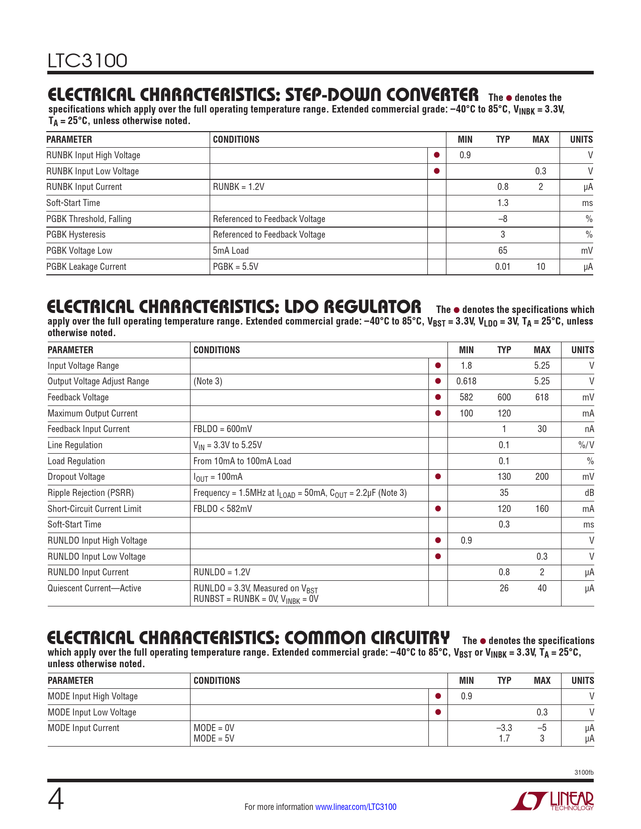 denotes the specifications which apply over the full operating temperature range. Extended commercial grade: –40°C to 85°C, VBST = 3.3V, VLDO = 3V, TA = 25°C, unless otherwise noted. PARAMETER CONDITIONS MIN TYP MAX UNITS