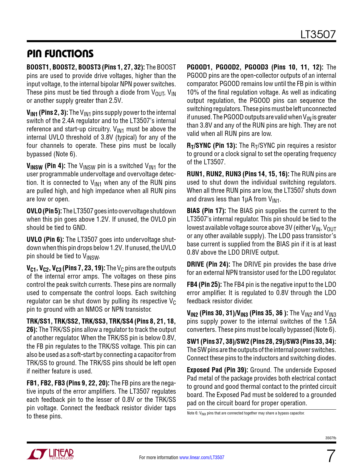 pin Functions BOOST1, BOOST2, BOOST3 (Pins 1, 27, 32): PGOOD1, PGOOD2, PGOOD3 (Pins 10, 11, 12): IN1 (Pins 2, 3):