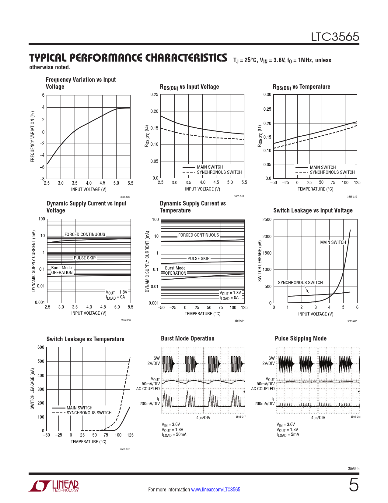 100 100 2500 10 FORCED CONTINUOUS 10 FORCED CONTINUOUS 2000 MAIN SWITCH 1 1 1500 Y CURRENT (mA) PULSE SKIP Y CURRENT (mA) PULSE SKIP 0.1 Burst Mode 0.1 Burst Mode 1000 OPERATION OPERATION SWITCH LEAKAGE (pA) SYNCHRONOUS SWITCH 0.01 0.01 500 DYNAMIC SUPPL VOUT = 1.8V DYNAMIC SUPPL VOUT = 1.8V ILOAD = 0A ILOAD = 0A 0.001 0.001 0 2.5 3.0 3.5 4.0 4.5 5.0 5.5 –50 –25 0 25 50 75 100 125 0 1 2 3 4 5 6 INPUT VOLTAGE (V) TEMPERATURE (°C) INPUT VOLTAGE (V) 3565 G13 3565 G14 3565 G15