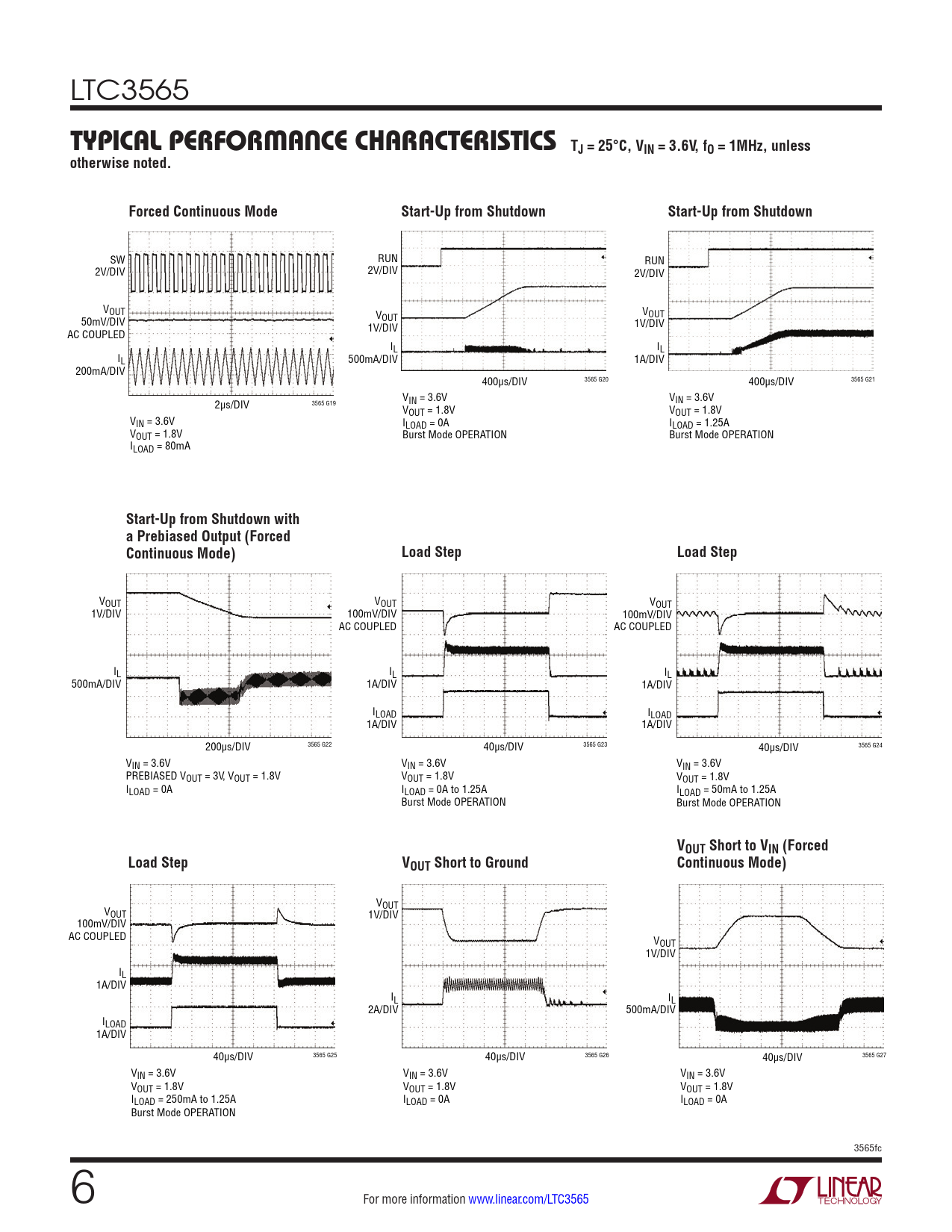 VOUT VOUT VOUT 1V/DIV 100mV/DIV 100mV/DIV AC COUPLED AC COUPLED IL IL IL 500mA/DIV 1A/DIV 1A/DIV ILOAD ILOAD 1A/DIV 1A/DIV 3565 G22 200µs/DIV 3565 G23 40µs/DIV 3565 G24 40µs/DIV VIN = 3.6V VIN = 3.6V VIN = 3.6V PREBIASED VOUT = 3V, VOUT = 1.8V VOUT = 1.8V VOUT = 1.8V ILOAD = 0A ILOAD = 0A to 1.25A ILOAD = 50mA to 1.25A Burst Mode OPERATION Burst Mode OPERATION