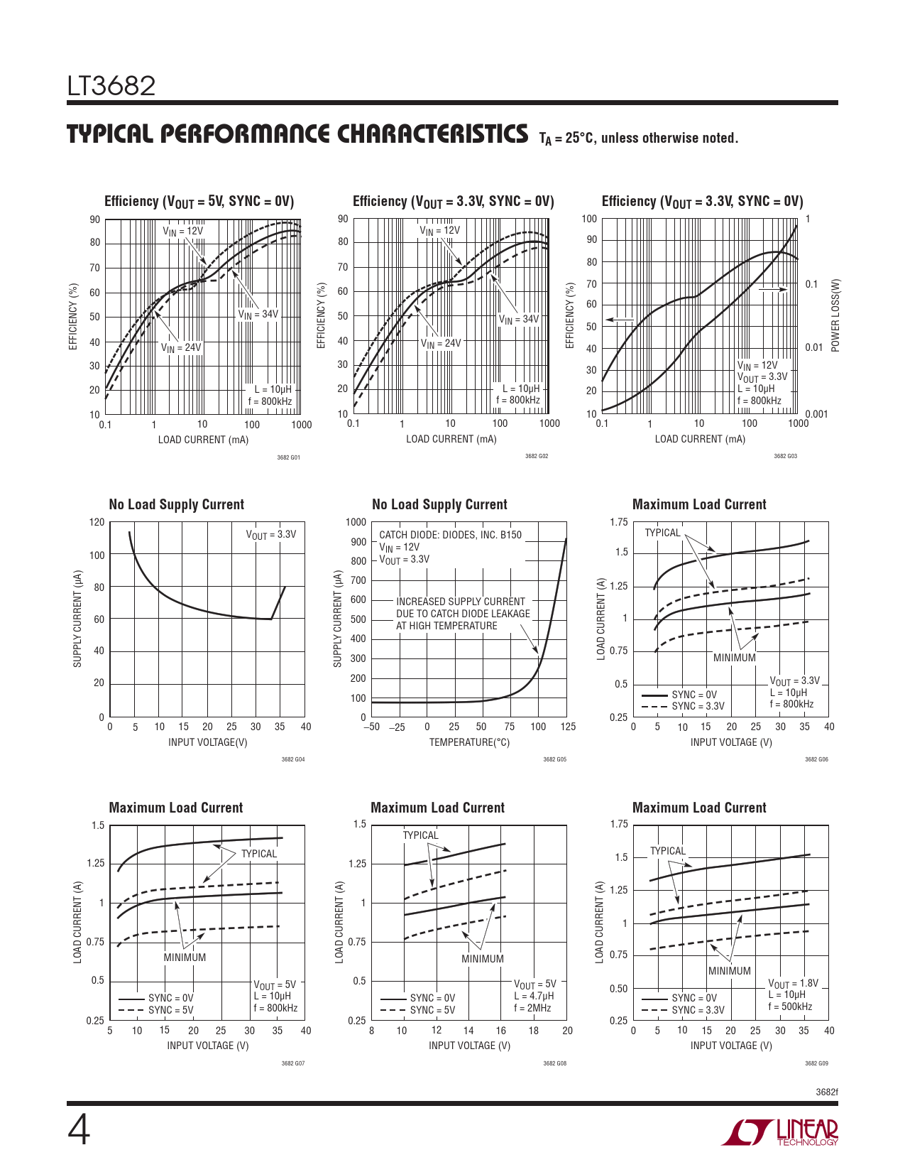 120 1000 1.75 VOUT = 3.3V CATCH DIODE: DIODES, INC. B150 TYPICAL 900 VIN = 12V 100 1.5 800 VOUT = 3.3V 700 80 1.25 600 INCREASED SUPPLY CURRENT DUE TO CATCH DIODE LEAKAGE 60 500 1 AT HIGH TEMPERATURE Y CURRENT (μA) Y CURRENT (μA) 400 40 0.75 300 LOAD CURRENT (A) MINIMUM SUPPL SUPPL 20 200 0.5 VOUT = 3.3V L = 10μH 100 SYNC = 0V f = 800kHz SYNC = 3.3V 0 0 0.25 0 5 10 15 20 25 30 35 40 50 25 0 25 50 75 100 125 0 5 10 15 20 25 30 35 40 INPUT VOLTAGE(V) TEMPERATURE(°C) INPUT VOLTAGE (V) 3682 G04 3682 G05 3682 G06