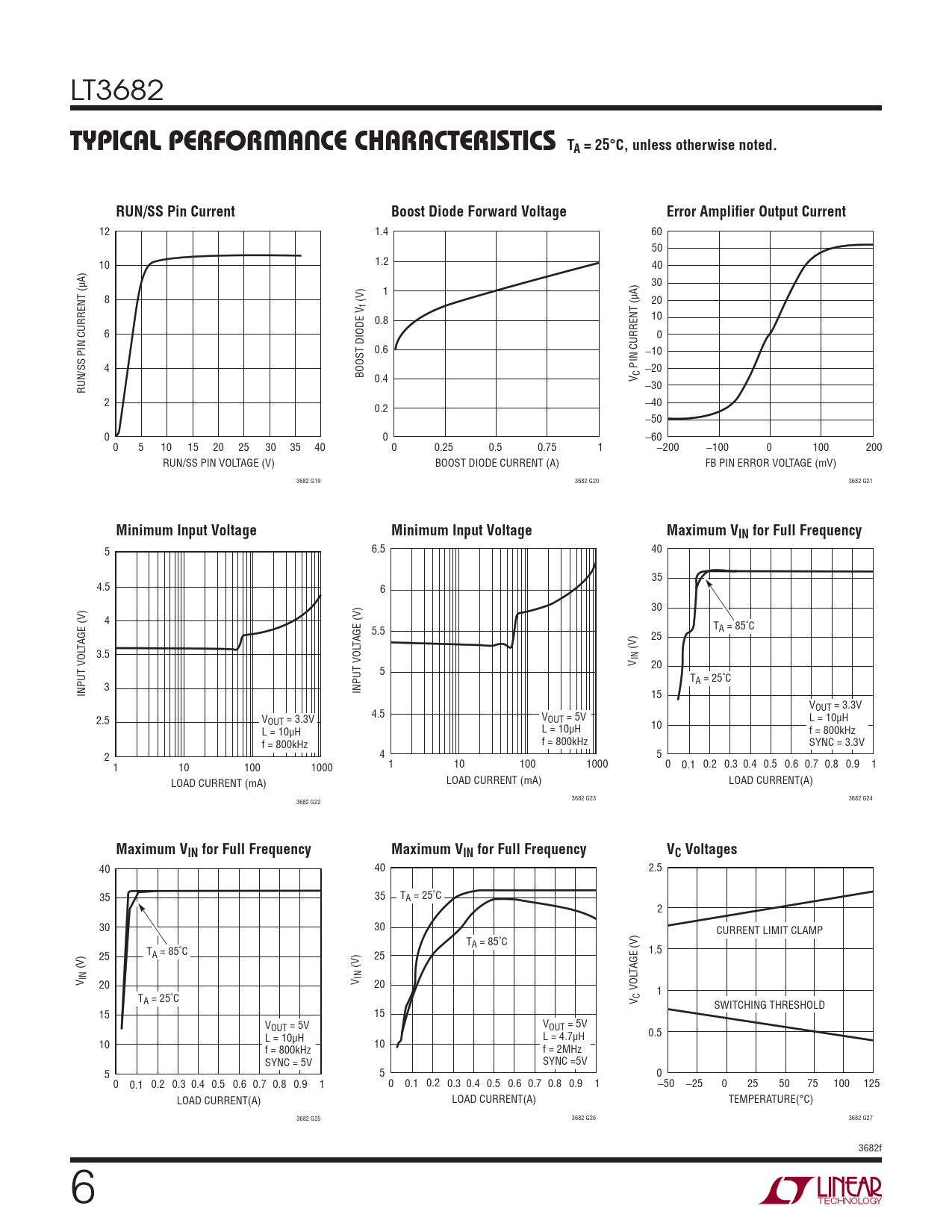 12 1.4 60 50 10 1.2 40 30 1 8 (V) 20 V f 0.8 10 6 0 0.6 10 4 PIN CURRENT (μA) 20 BOOST DIODE 0.4 V C RUN/SS PIN CURRENT (μA) 30 2 40 0.2 50 0 0 60 0 5 10 15 20 25 30 35 40 0 0.25 0.5 0.75 1 200 100 0 100 200 RUN/SS PIN VOLTAGE (V) BOOST DIODE CURRENT (A) FB PIN ERROR VOLTAGE (mV) 3682 G19 3682 G20 3682 G21