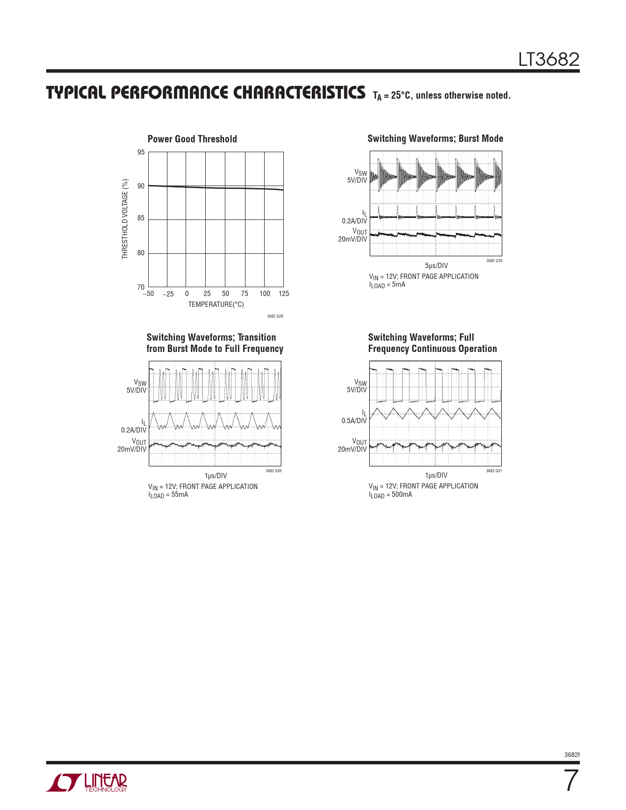 VSW VSW 5V/DIV 5V/DIV IL IL 0.5A/DIV 0.2A/DIV VOUT VOUT 20mV/DIV 20mV/DIV 3682 G30 3682 G31 1μs/DIV 1μs/DIV VIN = 12V; FRONT PAGE APPLICATION VIN = 12V; FRONT PAGE APPLICATION ILOAD = 55mA ILOAD = 500mA 3682f 7