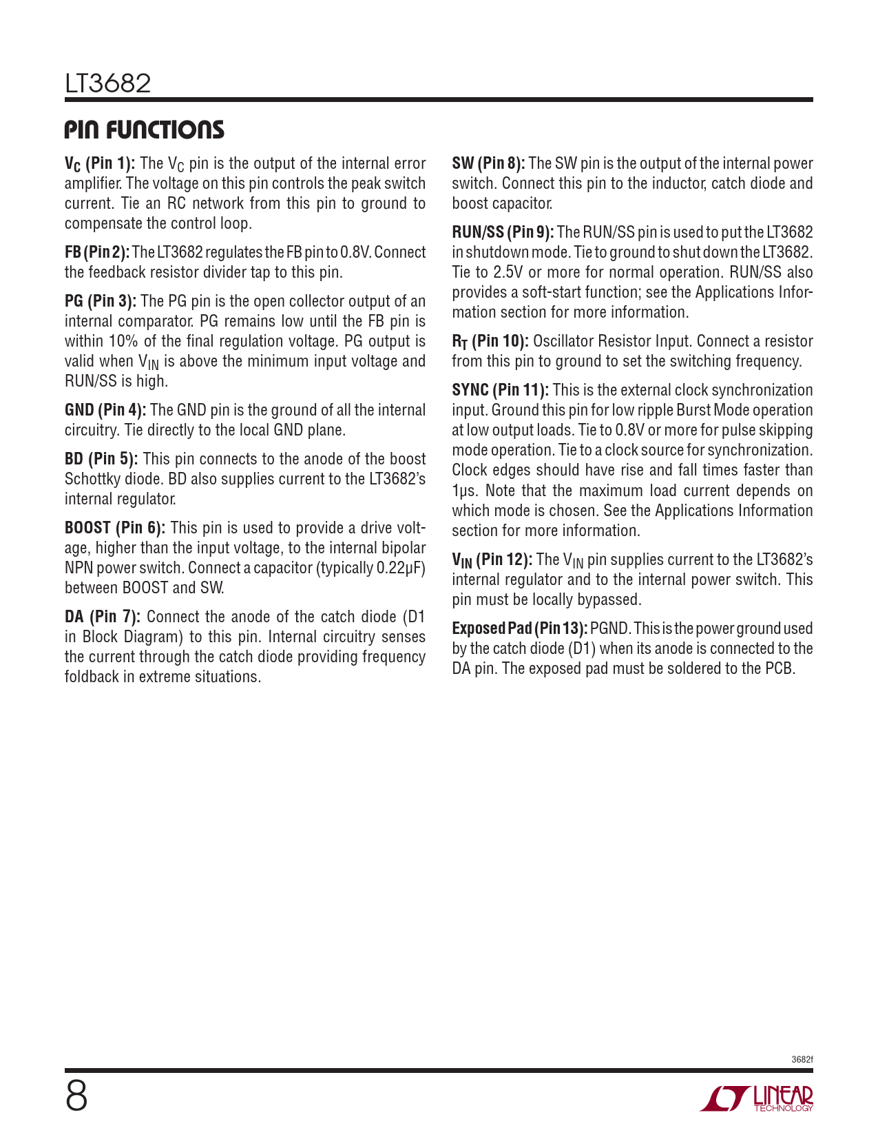 LT3682 PIN FUNCTIONSVC (Pin 1): The VC pin is the output of the internal error SW (Pin 8): The SW pin is the output of the internal power amplifi er. The voltage on this pin controls the peak switch switch. Connect this pin to the inductor, catch diode and current. Tie an RC network from this pin to ground to boost capacitor. compensate the control loop. RUN/SS (Pin 9): The RUN/SS pin is used to put the LT3682 FB (Pin 2): The LT3682 regulates the FB pin to 0.8V. Connect in shutdown mode. Tie to ground to shut down the LT3682. the feedback resistor divider tap to this pin. Tie to 2.5V or more for normal operation. RUN/SS also provides a soft-start function; see the Applications Infor- PG (Pin 3): The PG pin is the open collector output of an mation section for more information. internal comparator. PG remains low until the FB pin is within 10% of the fi nal regulation voltage. PG output is RT (Pin 10): Oscillator Resistor Input. Connect a resistor valid when VIN is above the minimum input voltage and from this pin to ground to set the switching frequency. RUN/SS is high. SYNC (Pin 11): This is the external clock synchronization GND (Pin 4): The GND pin is the ground of all the internal input. Ground this pin for low ripple Burst Mode operation circuitry. Tie directly to the local GND plane. at low output loads. Tie to 0.8V or more for pulse skipping mode operation. Tie to a clock source for synchronization. BD (Pin 5): This pin connects to the anode of the boost Clock edges should have rise and fall times faster than Schottky diode. BD also supplies current to the LT3682’s 1μs. Note that the maximum load current depends on internal regulator. which mode is chosen. See the Applications Information BOOST (Pin 6): This pin is used to provide a drive volt- section for more information. age, higher than the input voltage, to the internal bipolar V NPN power switch. Connect a capacitor (typically 0.22μF) IN (Pin 12): The VIN pin supplies current to the LT3682’s internal regulator and to the internal power switch. This between BOOST and SW. pin must be locally bypassed. DA (Pin 7): Connect the anode of the catch diode (D1 Exposed Pad (Pin 13): PGND. This is the power ground used in Block Diagram) to this pin. Internal circuitry senses by the catch diode (D1) when its anode is connected to the the current through the catch diode providing frequency DA pin. The exposed pad must be soldered to the PCB. foldback in extreme situations. 3682f 8