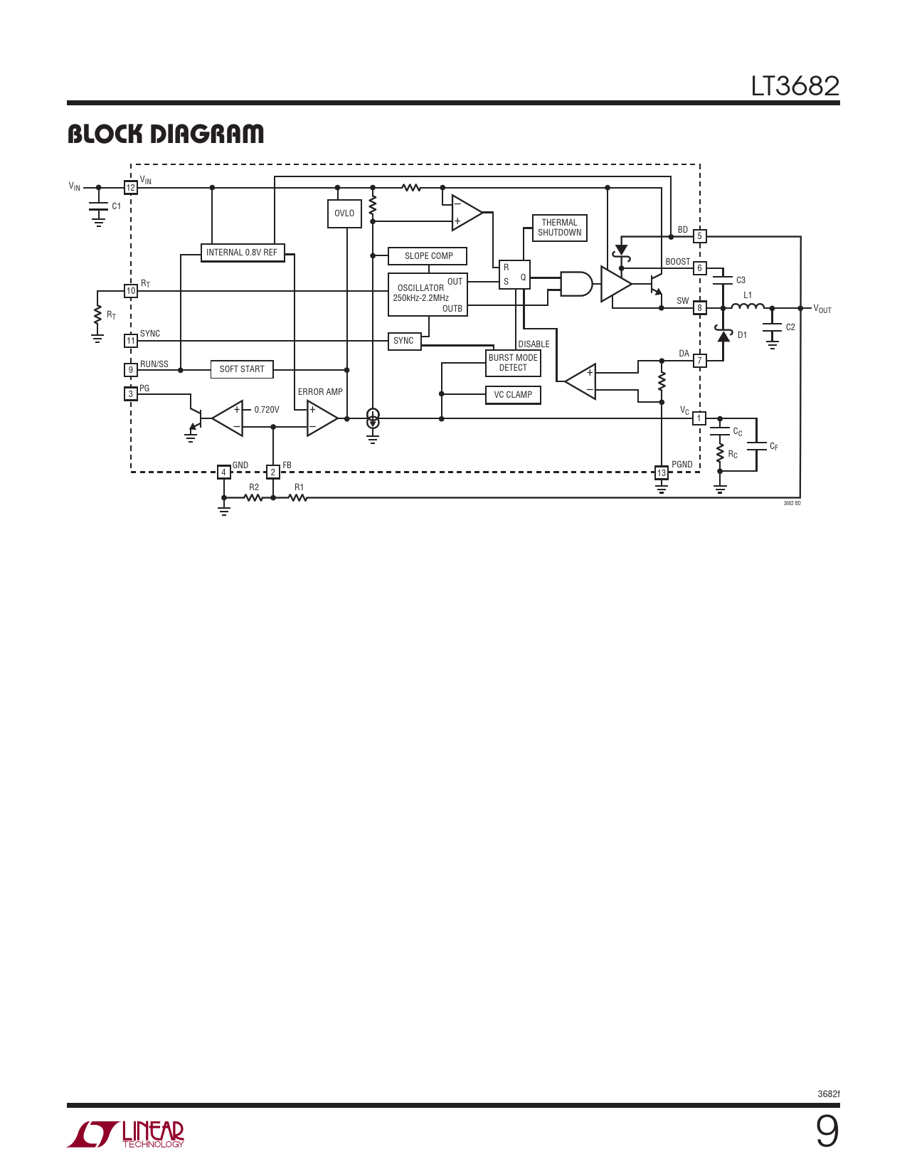 VIN VIN 12 – C1 OVLO + THERMAL SHUTDOWN BD 5 INTERNAL 0.8V REF SLOPE COMP BOOST R 6 R S Q C3 T OUT OSCILLATOR 10 250kHz-2.2MHz L1 SW OUTB 8 VOUT RT C2 SYNC D1 11 SYNC DISABLE DA BURST MODE RUN/SS 7 9 SOFT START DETECT + PG ERROR AMP – 3 VC CLAMP + 0.720V + VC 1 – – CC CF RC GND FB PGND 4 2 13 R2 R1 3682 BD 3682f 9