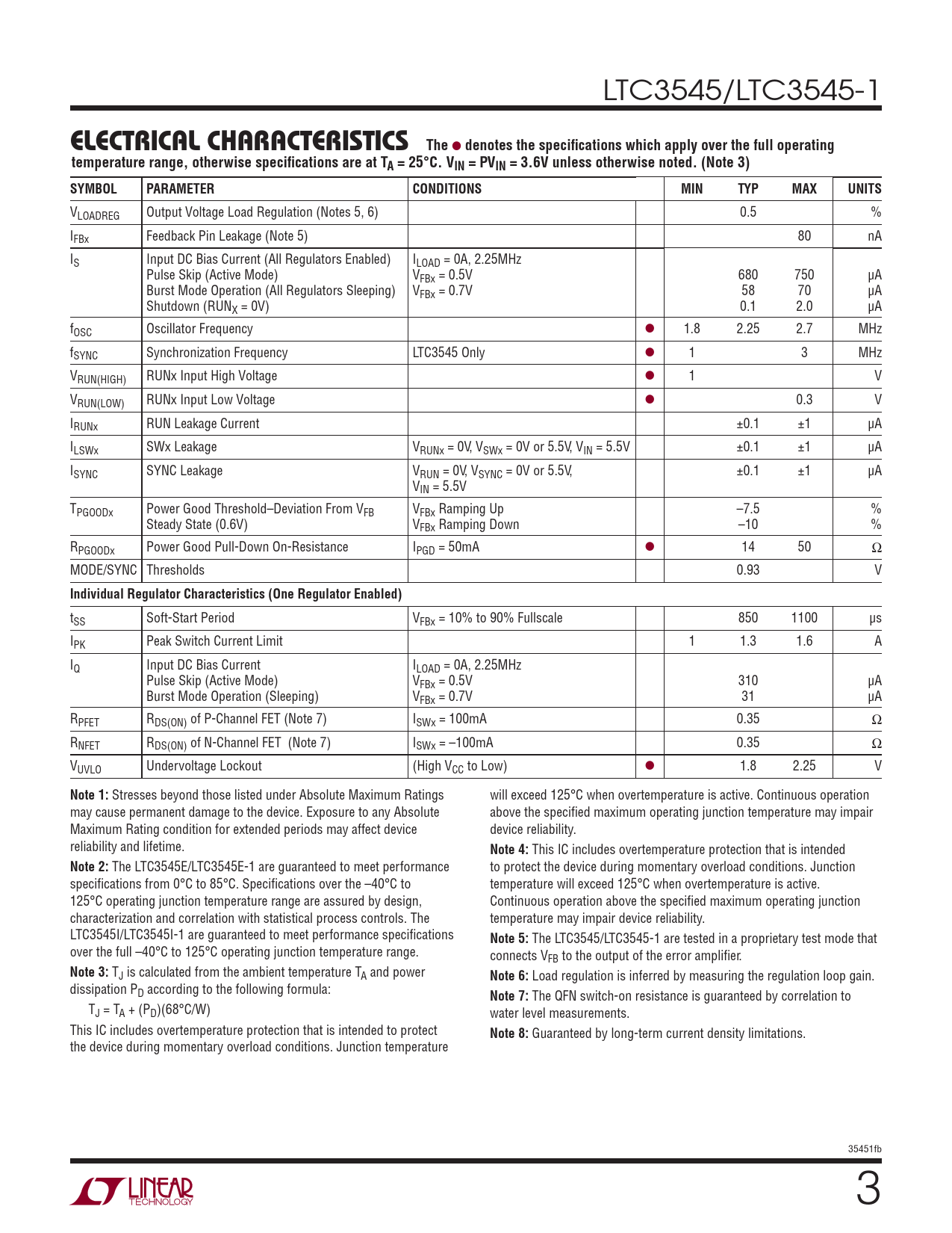 LTC3545/LTC3545-1 ELECTRICAL CHARACTERISTICSThe ● denotes the specifi cations which apply over the full operatingtemperature range, otherwise specifi cations are at TA = 25°C. VIN = PVIN = 3.6V unless otherwise noted. (Note 3)SYMBOLPARAMETERCONDITIONSMINTYPMAXUNITS VLOADREG Output Voltage Load Regulation (Notes 5, 6) 0.5 % IFBx Feedback Pin Leakage (Note 5) 80 nA IS Input DC Bias Current (All Regulators Enabled) ILOAD = 0A, 2.25MHz Pulse Skip (Active Mode) VFBx = 0.5V 680 750 μA Burst Mode Operation (All Regulators Sleeping) VFBx = 0.7V 58 70 μA Shutdown (RUNX = 0V) 0.1 2.0 μA fOSC Oscillator Frequency ● 1.8 2.25 2.7 MHz fSYNC Synchronization Frequency LTC3545 Only ● 1 3 MHz VRUN(HIGH) RUNx Input High Voltage ● 1 V VRUN(LOW) RUNx Input Low Voltage ● 0.3 V IRUNx RUN Leakage Current ±0.1 ±1 μA ILSWx SWx Leakage VRUNx = 0V, VSWx = 0V or 5.5V, VIN = 5.5V ±0.1 ±1 μA ISYNC SYNC Leakage VRUN = 0V, VSYNC = 0V or 5.5V, ±0.1 ±1 μA VIN = 5.5V TPGOODx Power Good Threshold–Deviation From VFB VFBx Ramping Up –7.5 % Steady State (0.6V) VFBx Ramping Down –10 % RPGOODx Power Good Pull-Down On-Resistance IPGD = 50mA ● 14 50 Ω MODE/SYNC Thresholds 0.93 V Individual Regulator Characteristics (One Regulator Enabled) tSS Soft-Start Period VFBx = 10% to 90% Fullscale 850 1100 μs IPK Peak Switch Current Limit 1 1.3 1.6 A IQ Input DC Bias Current ILOAD = 0A, 2.25MHz Pulse Skip (Active Mode) VFBx = 0.5V 310 μA Burst Mode Operation (Sleeping) VFBx = 0.7V 31 μA RPFET RDS(ON) of P-Channel FET (Note 7) ISWx = 100mA 0.35 Ω RNFET RDS(ON) of N-Channel FET (Note 7) ISWx = –100mA 0.35 Ω VUVLO Undervoltage Lockout (High VCC to Low) ● 1.8 2.25 V Note 1: Stresses beyond those listed under Absolute Maximum Ratings will exceed 125°C when overtemperature is active. Continuous operation may cause permanent damage to the device. Exposure to any Absolute above the specifi ed maximum operating junction temperature may impair Maximum Rating condition for extended periods may affect device device reliability. reliability and lifetime. Note 4: This IC includes overtemperature protection that is intended Note 2: The LTC3545E/LTC3545E-1 are guaranteed to meet performance to protect the device during momentary overload conditions. Junction specifi cations from 0°C to 85°C. Specifi cations over the –40°C to temperature will exceed 125°C when overtemperature is active. 125°C operating junction temperature range are assured by design, Continuous operation above the specifi ed maximum operating junction characterization and correlation with statistical process controls. The temperature may impair device reliability. LTC3545I/LTC3545I-1 are guaranteed to meet performance specifi cations Note 5: The LTC3545/LTC3545-1 are tested in a proprietary test mode that over the full –40°C to 125°C operating junction temperature range. connects VFB to the output of the error amplifi er. Note 3: TJ is calculated from the ambient temperature TA and power Note 6: Load regulation is inferred by measuring the regulation loop gain. dissipation PD according to the following formula: Note 7: The QFN switch-on resistance is guaranteed by correlation to TJ = TA + (PD)(68°C/W) water level measurements. This IC includes overtemperature protection that is intended to protect Note 8: Guaranteed by long-term current density limitations. the device during momentary overload conditions. Junction temperature 35451fb 3