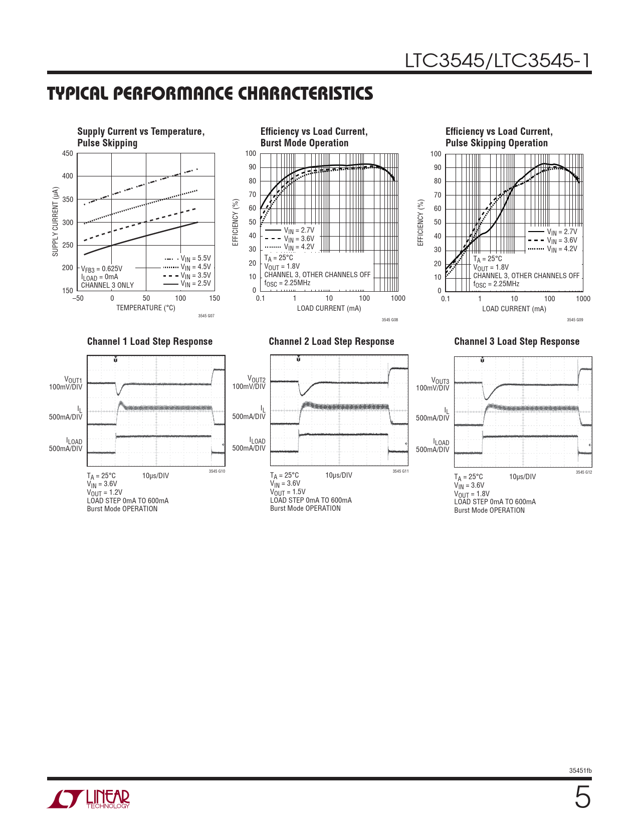 450 100 100 90 90 400 80 80 70 70 350 60 60 300 50 50 VIN = 2.7V V 40 IN = 2.7V V 40 IN = 3.6V V 250 EFFICIENCY (%) EFFICIENCY (%) IN = 3.6V 30 VIN = 4.2V 30 VIN = 4.2V SUPPLY CURRENT (μA) VIN = 5.5V T T 20 A = 25°C 20 A = 25°C 200 V V V V FB3 = 0.625V IN = 4.5V OUT = 1.8V OUT = 1.8V I V CHANNEL 3, OTHER CHANNELS OFF CHANNEL 3, OTHER CHANNELS OFF LOAD = 0mA IN = 3.5V 10 10 CHANNEL 3 ONLY VIN = 2.5V fOSC = 2.25MHz fOSC = 2.25MHz 150 0 0 –50 0 50 100 150 0.1 1 10 100 1000 0.1 1 10 100 1000 TEMPERATURE (°C) LOAD CURRENT (mA) LOAD CURRENT (mA) 3545 G07 3545 G08 3545 G09