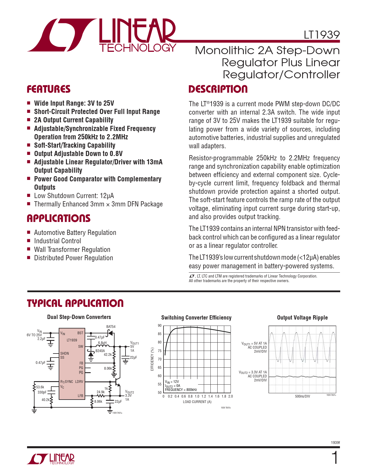 LT1939 Monolithic 2A Step-Down Regulator Plus Linear Regulator/Controller FEATURESDESCRIPTION n Wide Input Range: 3V to 25V The LT®1939 is a current mode PWM step-down DC/DC n Short-Circuit Protected Over Full Input Range converter with an internal 2.3A switch. The wide input n 2A Output Current Capability range of 3V to 25V makes the LT1939 suitable for regu- n Adjustable/Synchronizable Fixed Frequency lating power from a wide variety of sources, including Operation from 250kHz to 2.2MHz automotive batteries, industrial supplies and unregulated n Soft-Start/Tracking Capability wall adapters. n Output Adjustable Down to 0.8V Resistor-programmable 250kHz to 2.2MHz frequency n Adjustable Linear Regulator/Driver with 13mA range and synchronization capability enable optimization Output Capability between effi ciency and external component size. Cycle- n Power Good Comparator with Complementary by-cycle current limit, frequency foldback and thermal Outputs shutdown provide protection against a shorted output. n Low Shutdown Current: 12μA The soft-start feature controls the ramp rate of the output n Thermally Enhanced 3mm × 3mm DFN Package voltage, eliminating input current surge during start-up, APPLICATIONS and also provides output tracking. The LT1939 contains an internal NPN transistor with feed- n Automotive Battery Regulation back control which can be confi gured as a linear regulator n Industrial Control or as a linear regulator controller. n Wall Transformer Regulation n Distributed Power Regulation The LT1939’s low current shutdown mode (<12μA) enables easy power management in battery-powered systems. L, LT, LTC and LTM are registered trademarks of Linear Technology Corporation. All other trademarks are the property of their respective owners. TYPICAL APPLICATIONDual Step-Down ConvertersSwitching Converter Effi ciencyOutput Voltage Ripple BAT54 90 VIN V BST 6V TO 25V IN 85 0.47μF 2.2μF LT1939 6.8μH VOUT1 80 VOUT1 = 5V AT 1A SW 5V AC COUPLED B240A 1A 75 2mV/DIV SHDN 42.2k SS 22μF 70 0.47μF FB PG 8.06k 65 EFFICIENCY (%) PG VOUT2 = 3.3V AT 1A 60 AC COUPLED R 2mV/DIV T/SYNC LDRV V 55 IN = 12V 53.6k V I C OUT2 = 0A 1k FREQUENCY = 800kHz 330pF 24.9k VOUT2 50 LFB 3.3V 0 0.2 0.4 0.6 0.8 1.0 1.2 1.4 1.6 1.8 2.0 500ns/DIV 1939 TA01c 40.2k 1A 8.06k 22μF LOAD CURRENT (A) 1939 TA01b 1939 TA01a 1939f 1