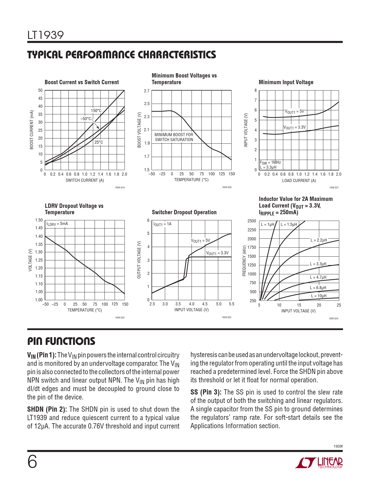 LT1939 TYPICAL PERFORMANCE CHARACTERISTICSMinimum Boost Voltages vsBoost Current vs Switch CurrentTemperatureMinimum Input Voltage 50 2.7 8 45 7 2.5 40 150°C 6 V 35 OUT1 = 5V –50°C 2.3 5 30 VOUT1 = 3.3V 25 2.1 4 MINIMUM BOOST FOR 20 SWITCH SATURATION 3 25°C 1.9 INPUT VOLTAGE (V) BOOST CURRENT (mA) 15 BOOST VOLTAGE (V) 2 10 1.7 1 5 FSW = 1MHz L = 3.3μH 0 1.5 0 0 0.2 0.4 0.6 0.8 1.0 1.2 1.4 1.6 1.8 2.0 –50 –25 0 25 50 75 100 125 150 0 0.2 0.4 0.6 0.8 1.0 1.2 1.4 1.6 1.8 2.0 SWITCH CURRENT (A) TEMPERATURE (°C) LOAD CURRENT (A) 1939 G19 1939 G20 1939 G21 Inductor Value for 2A MaximumLDRV Dropout Voltage vsLoad Current (VOUT = 3.3V,TemperatureSwitcher Dropout OperationIRIPPLE = 250mA) 1.50 6 2500 ILDRV = 5mA IOUT1 = 1A L = 1μH L = 1.5μH 1.45 2250 5 1.40 V 2000 OUT1 = 5V L = 2.2μH 1.35 4 1750 1.30 VOUT1 = 3.3V 1500 1.25 3 1250 L = 3.3μH VOLTAGE (V) 1.20 2 1.15 FREQUENCY (kHz) 1000 OUTPUT VOLTAGE (V) L = 4.7μH 1.10 750 1 L = 6.8μH 1.05 500 L = 10μH 1.00 0 250 –50 –25 0 25 50 75 100 125 150 2.5 3.0 3.5 4.0 4.5 5.0 5.5 5 10 15 20 25 TEMPERATURE (°C) INPUT VOLTAGE (V) INPUT VOLTAGE (V) 1939 G22 1939 G23 1939 G24 PIN FUNCTIONS VIN (Pin 1): The VIN pin powers the internal control circuitry hysteresis can be used as an undervoltage lockout, prevent- and is monitored by an undervoltage comparator. The VIN ing the regulator from operating until the input voltage has pin is also connected to the collectors of the internal power reached a predetermined level. Force the SHDN pin above NPN switch and linear output NPN. The VIN pin has high its threshold or let it fl oat for normal operation. dI/dt edges and must be decoupled to ground close to SS (Pin 3): The SS pin is used to control the slew rate the pin of the device. of the output of both the switching and linear regulators. SHDN (Pin 2): The SHDN pin is used to shut down the A single capacitor from the SS pin to ground determines LT1939 and reduce quiescent current to a typical value the regulators’ ramp rate. For soft-start details see the of 12μA. The accurate 0.76V threshold and input current Applications Information section. 1939f 6