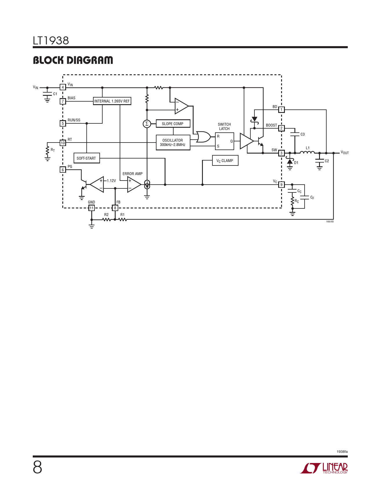 VIN VIN 4 C1 BIAS – 7 INTERNAL 1.265V REF + BD 1 RUN/SS 5 ∑ SLOPE COMP SWITCH BOOST LATCH 2 R C3 RT OSCILLATOR Q 10 300kHz–2.8MHz S RT SW L1 V 3 OUT SOFT-START VC CLAMP C2 D1 PG 6 ERROR AMP + 1.12V + VC – – 9 CC CF R GND FB C 11 8 R2 R1 1938 BD 1938fa 8 Document Outline FEATURES DESCRIPTION APPLICATIONS TYPICAL APPLICATION ABSOLUTE MAXIMUM RATINGS PIN CONFIGURATION ORDER INFORMATION ELECTRICAL ChARACTERISTICS TYPICAL PERFORMANCE ChARACTERISTICS PIN FUNCTIONS BLOCK DIAGRAM OPERATION APPLICATIONS INFORMATION TYPICAL APPLICATIONS PACKAGE DESCRIPTION TYPICAL APPLICATION RELATED PARTS