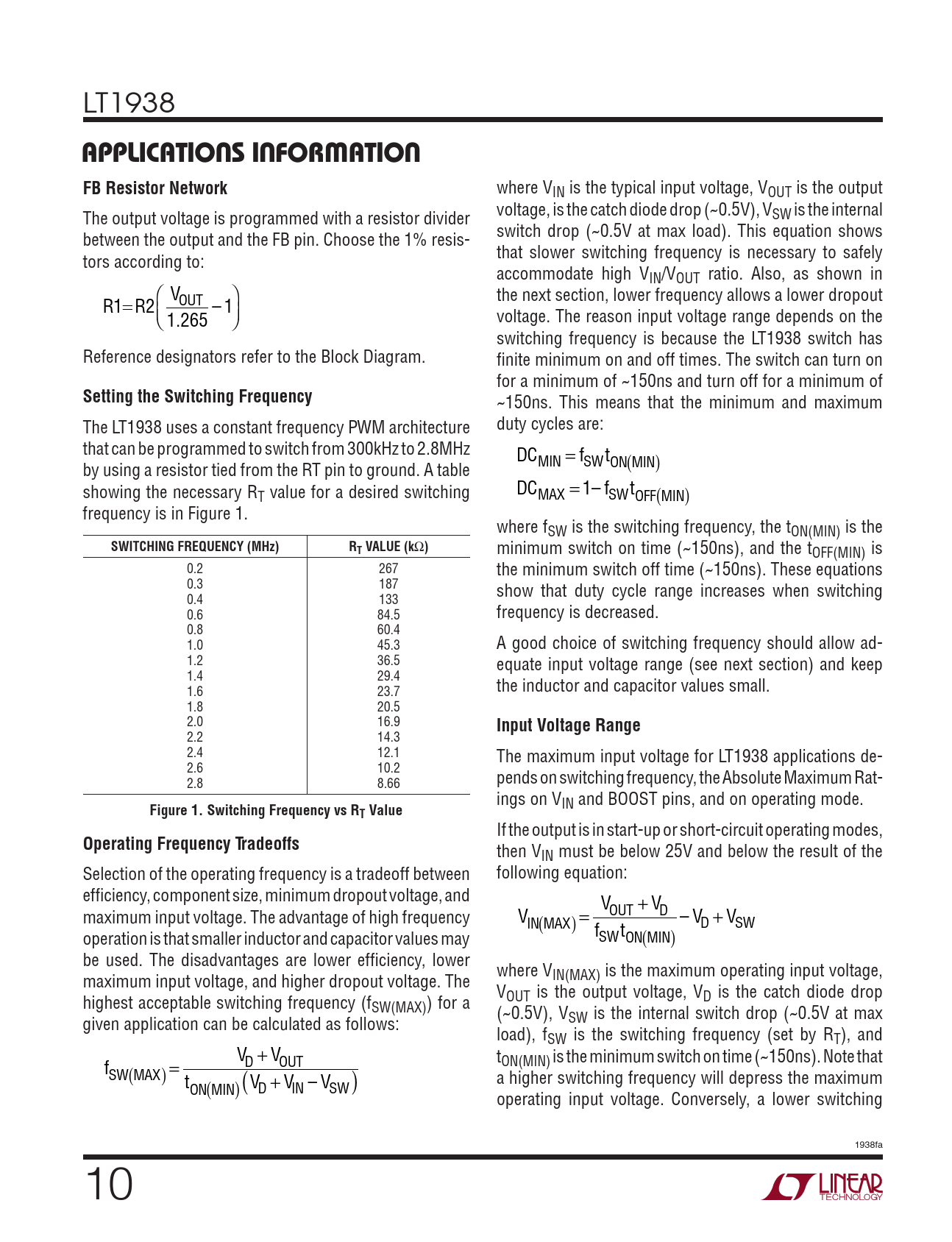 ~150ns. This means that the minimum and maximum The LT1938 uses a constant frequency PWM architecture duty cycles are: that can be programmed to switch from 300kHz to 2.8MHz DC = f t by using a resistor tied from the RT pin to ground. A table MIN SW ON MI ( N) showing the necessary RT value for a desired switching DC = 1– f t MAX SW OFF M ( IN) frequency is in Figure 1. where fSW is the switching frequency, the tON(MIN) is the