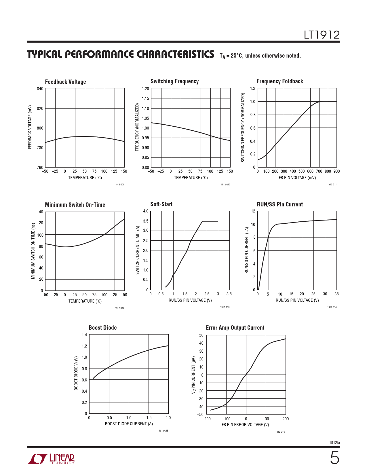 140 4.0 12 3.5 120 10 3.0 100 8 2.5 80 2.0 6 60 1.5 4 40 1.0 SWITCH CURRENT LIMIT (A) RUN/SS PIN CURRENT (µA) MINIMUM SWITCH ON TIME (ns) 20 2 0.5 0 0 0 –50 –25 0 25 50 75 100 125 150 0 0.5 1 1.5 2 2.5 3 3.5 0 5 10 15 20 25 30 35 TEMPERATURE (˚C) RUN/SS PIN VOLTAGE (V) RUN/SS PIN VOLTAGE (V) 1912 G13 1912 G12 1912 G14