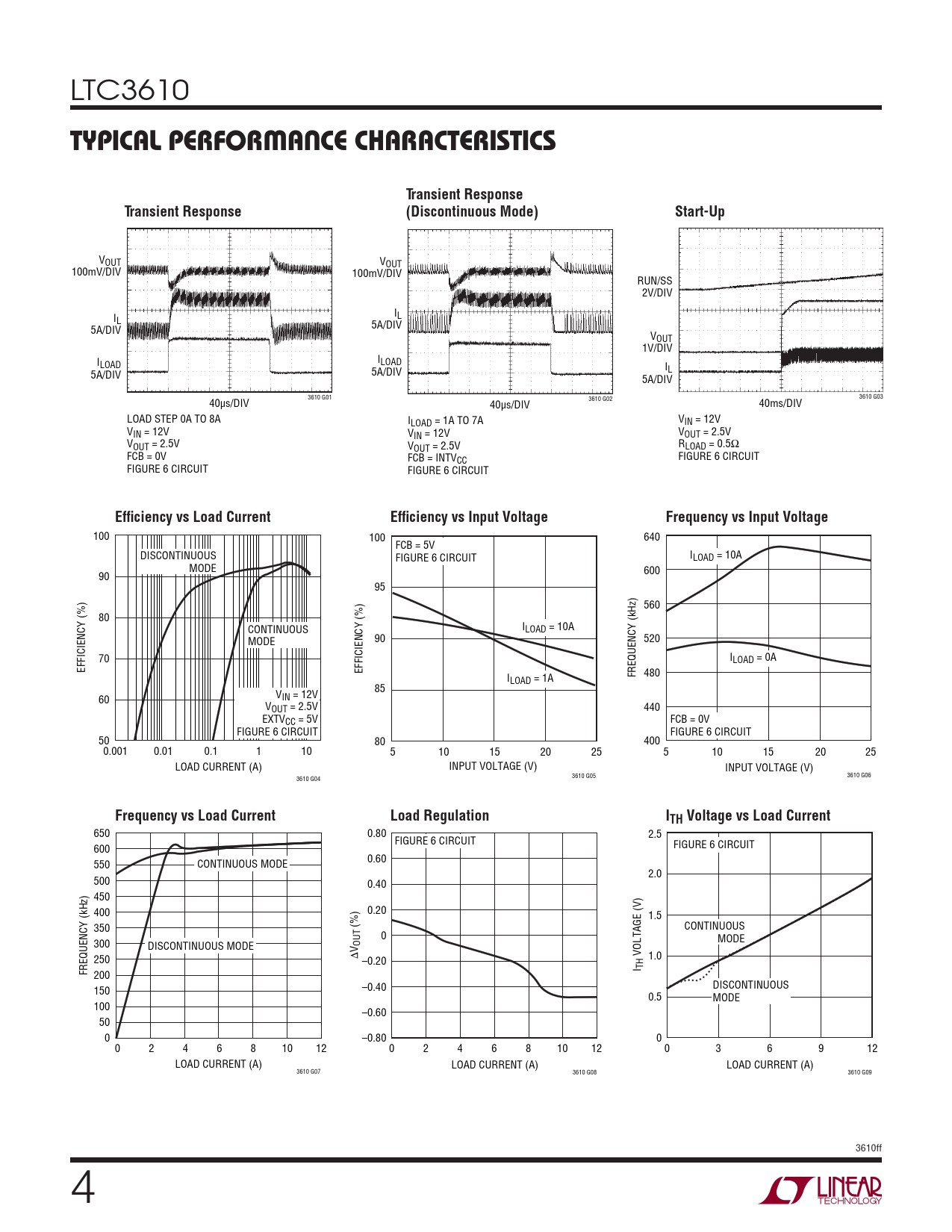 VOUT VOUT 100mV/DIV 100mV/DIV RUN/SS 2V/DIV I I L L 5A/DIV 5A/DIV VOUT 1V/DIV I I LOAD LOAD I 5A/DIV 5A/DIV L 5A/DIV 3610 G01 40µs/DIV 3610 G02 3610 G03 40µs/DIV 40ms/DIV LOAD STEP 0A TO 8A ILOAD = 1A TO 7A VIN = 12V VIN = 12V VIN = 12V VOUT = 2.5V VOUT = 2.5V VOUT = 2.5V RLOAD = 0.5Ω FCB = 0V FCB = INTVCC FIGURE 6 CIRCUIT FIGURE 6 CIRCUIT FIGURE 6 CIRCUIT