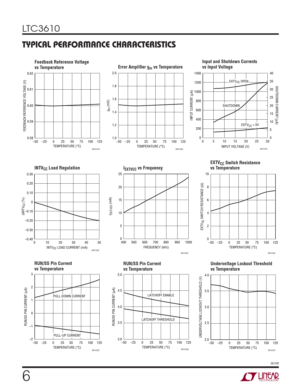0.30 25 10 0.20 20 8 0.10 15 6 (%) 0 (mA) CC INTV –0.10 10 4 Δ I EXTVCC SWITCH RESISTANCE (Ω) –0.20 CC 5 2 –0.30 EXTV –0.40 0 0 0 10 20 30 40 50 400 500 600 700 800 900 1000 –50 –25 0 25 50 75 100 125 INTV FREQUENCY (kHz) TEMPERATURE (°C) CC LOAD CURRENT (mA) 3610 G22 3610 G23 3610 G24