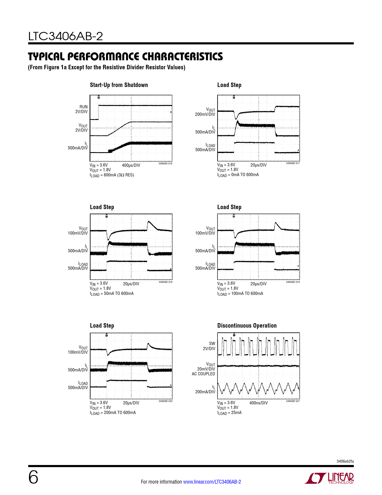 SW VOUT 2V/DIV 100mV/DIV IL VOUT 500mA/DIV 20mV/DIV AC COUPLED ILOAD 500mA/DIV IL 200mA/DIV V 3406AB2 G20 3406AB2 G21 IN = 3.6V 20µs/DIV VIN = 3.6V 400ns/DIV VOUT = 1.8V VOUT = 1.8V ILOAD = 200mA TO 600mA ILOAD = 25mA 3406ab2fa 6 For more information www.linear.com/LTC3406AB-2