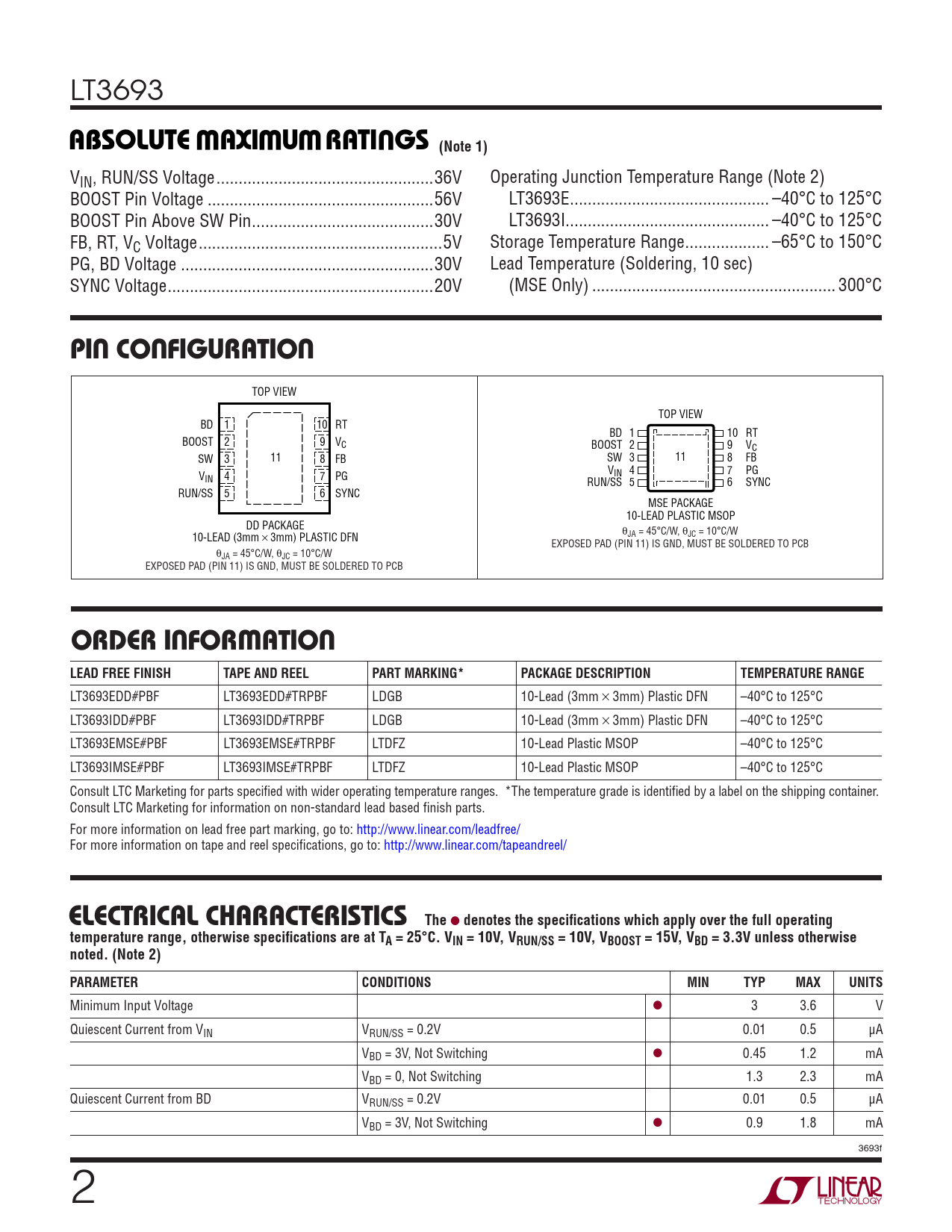 LT3693EDD#PBF LT3693EDD#TRPBF LDGB 10-Lead (3mm × 3mm) Plastic DFN –40°C to 125°C LT3693IDD#PBF LT3693IDD#TRPBF LDGB 10-Lead (3mm × 3mm) Plastic DFN –40°C to 125°C LT3693EMSE#PBF LT3693EMSE#TRPBF LTDFZ 10-Lead Plastic MSOP –40°C to 125°C LT3693IMSE#PBF LT3693IMSE#TRPBF LTDFZ 10-Lead Plastic MSOP –40°C to 125°C Consult LTC Marketing for parts specifi ed with wider operating temperature ranges. *The temperature grade is identifi ed by a label on the shipping container. Consult LTC Marketing for information on non-standard lead based fi nish parts. For more information on lead free part marking, go to: http://www.linear.com/leadfree/ For more information on tape and reel specifi cations, go to: http://www.linear.com/tapeandreel/