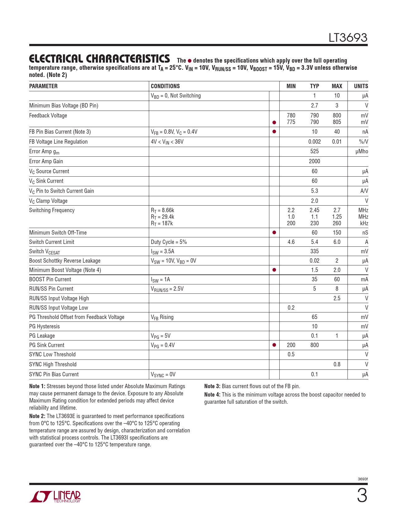 LT3693 TheELECTRICAL CHARACTERISTICS ● denotes the specifi cations which apply over the full operatingtemperature range, otherwise specifi cations are at TA = 25°C. VIN = 10V, VRUN/SS = 10V, VBOOST = 15V, VBD = 3.3V unless otherwisenoted. (Note 2)PARAMETERCONDITIONSMINTYPMAXUNITS VBD = 0, Not Switching 1 10 μA Minimum Bias Voltage (BD Pin) 2.7 3 V Feedback Voltage 780 790 800 mV ● 775 790 805 mV FB Pin Bias Current (Note 3) VFB = 0.8V, VC = 0.4V ● 10 40 nA FB Voltage Line Regulation 4V < VIN < 36V 0.002 0.01 %/V Error Amp gm 525 μMho Error Amp Gain 2000 VC Source Current 60 μA VC Sink Current 60 μA VC Pin to Switch Current Gain 5.3 A/V VC Clamp Voltage 2.0 V Switching Frequency RT = 8.66k 2.2 2.45 2.7 MHz RT = 29.4k 1.0 1.1 1.25 MHz RT = 187k 200 230 260 kHz Minimum Switch Off-Time ● 60 150 nS Switch Current Limit Duty Cycle = 5% 4.6 5.4 6.0 A Switch VCESAT ISW = 3.5A 335 mV Boost Schottky Reverse Leakage VSW = 10V, VBD = 0V 0.02 2 μA Minimum Boost Voltage (Note 4) ● 1.5 2.0 V BOOST Pin Current ISW = 1A 35 60 mA RUN/SS Pin Current VRUN/SS = 2.5V 5 8 μA RUN/SS Input Voltage High 2.5 V RUN/SS Input Voltage Low 0.2 V PG Threshold Offset from Feedback Voltage VFB Rising 65 mV PG Hysteresis 10 mV PG Leakage VPG = 5V 0.1 1 μA PG Sink Current VPG = 0.4V ● 200 800 μA SYNC Low Threshold 0.5 V SYNC High Threshold 0.8 V SYNC Pin Bias Current VSYNC = 0V 0.1 μA Note 1: Stresses beyond those listed under Absolute Maximum Ratings Note 3: Bias current fl ows out of the FB pin. may cause permanent damage to the device. Exposure to any Absolute Note 4: This is the minimum voltage across the boost capacitor needed to Maximum Rating condition for extended periods may affect device guarantee full saturation of the switch. reliability and lifetime. Note 2: The LT3693E is guaranteed to meet performance specifi cations from 0°C to 125°C. Specifi cations over the –40°C to 125°C operating temperature range are assured by design, characterization and correlation with statistical process controls. The LT3693I specifi cations are guaranteed over the –40°C to 125°C temperature range. 3693f 3