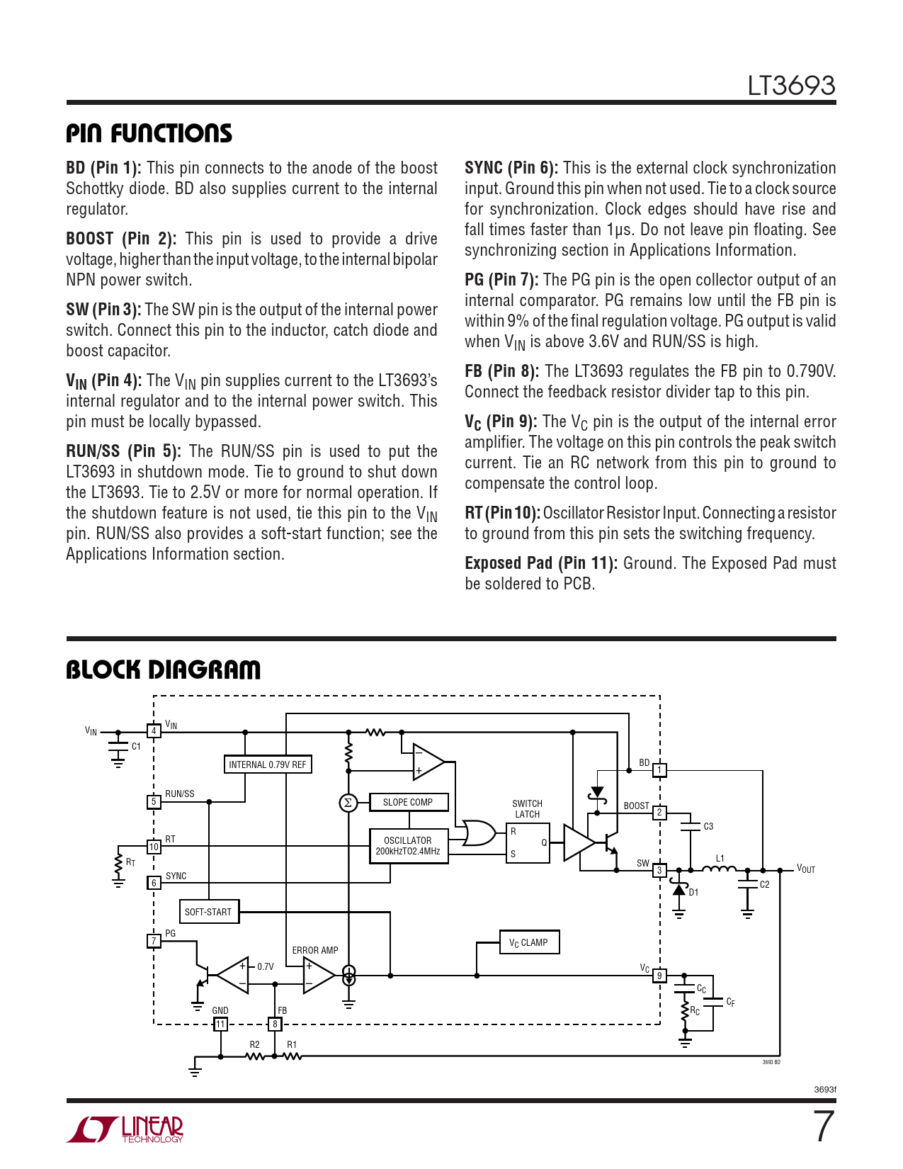 VIN VIN 4 C1 – INTERNAL 0.79V REF + BD 1 RUN/SS 5 SLOPE COMP 5 SWITCH BOOST LATCH 2 C3 R RT OSCILLATOR Q 10 200kHzTO2.4MHz S L1 RT SW V 3 OUT SYNC 6 C2 D1 SOFT-START PG 7 VC CLAMP ERROR AMP + 0.7V + VC 9 – – CC CF GND FB RC 11 8 R2 R1 3693 BD 3693f 7
