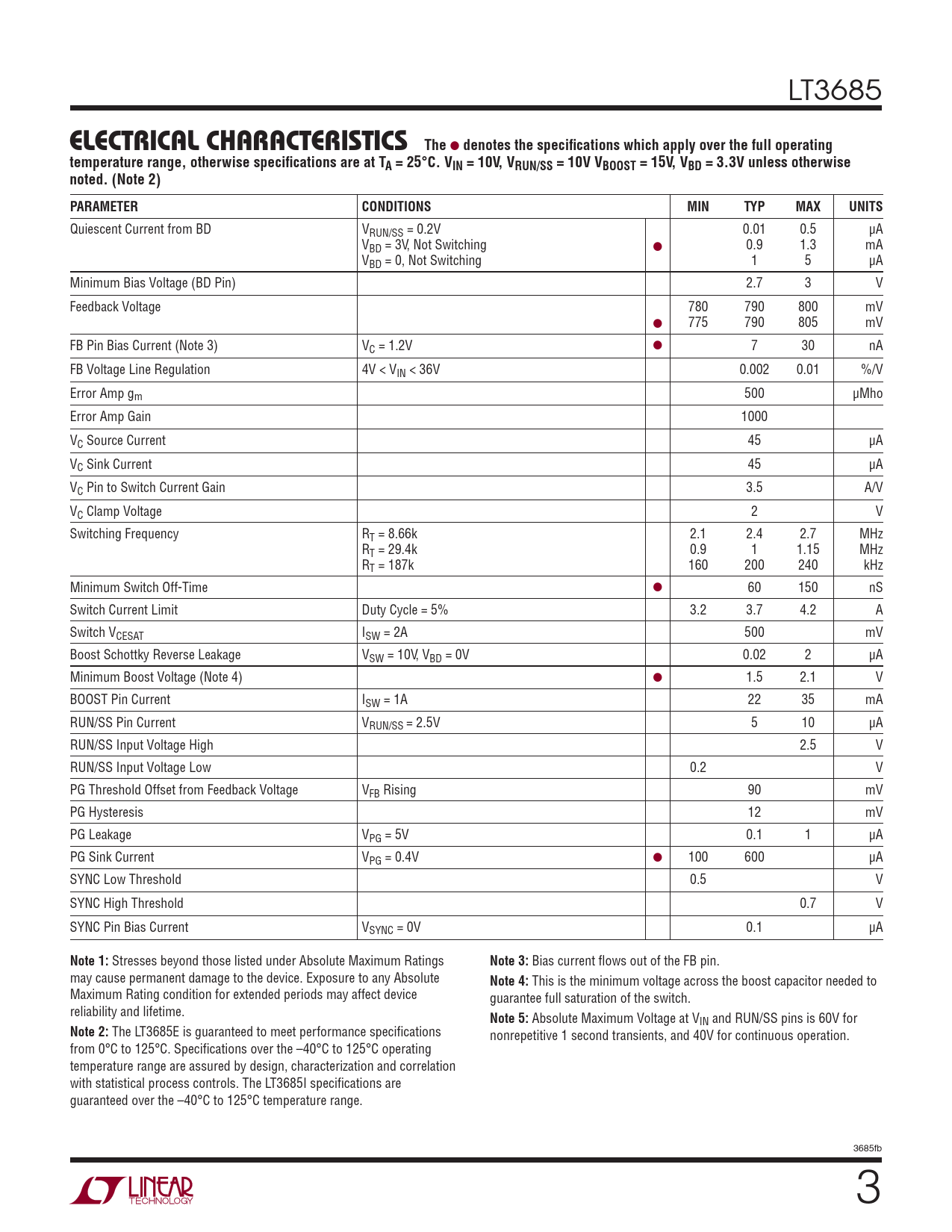 LT3685 TheELECTRICAL CHARACTERISTICS ● denotes the specifi cations which apply over the full operatingtemperature range, otherwise specifi cations are at TA = 25°C. VIN = 10V, VRUN/SS = 10V VBOOST = 15V, VBD = 3.3V unless otherwisenoted. (Note 2)PARAMETERCONDITIONSMINTYPMAXUNITS Quiescent Current from BD VRUN/SS = 0.2V 0.01 0.5 μA VBD = 3V, Not Switching ● 0.9 1.3 mA VBD = 0, Not Switching 1 5 μA Minimum Bias Voltage (BD Pin) 2.7 3 V Feedback Voltage 780 790 800 mV ● 775 790 805 mV FB Pin Bias Current (Note 3) VC = 1.2V ● 7 30 nA FB Voltage Line Regulation 4V < VIN < 36V 0.002 0.01 %/V Error Amp gm 500 μMho Error Amp Gain 1000 VC Source Current 45 μA VC Sink Current 45 μA VC Pin to Switch Current Gain 3.5 A/V VC Clamp Voltage 2 V Switching Frequency RT = 8.66k 2.1 2.4 2.7 MHz RT = 29.4k 0.9 1 1.15 MHz RT = 187k 160 200 240 kHz Minimum Switch Off-Time ● 60 150 nS Switch Current Limit Duty Cycle = 5% 3.2 3.7 4.2 A Switch VCESAT ISW = 2A 500 mV Boost Schottky Reverse Leakage VSW = 10V, VBD = 0V 0.02 2 μA Minimum Boost Voltage (Note 4) ● 1.5 2.1 V BOOST Pin Current ISW = 1A 22 35 mA RUN/SS Pin Current VRUN/SS = 2.5V 5 10 μA RUN/SS Input Voltage High 2.5 V RUN/SS Input Voltage Low 0.2 V PG Threshold Offset from Feedback Voltage VFB Rising 90 mV PG Hysteresis 12 mV PG Leakage VPG = 5V 0.1 1 μA PG Sink Current VPG = 0.4V ● 100 600 μA SYNC Low Threshold 0.5 V SYNC High Threshold 0.7 V SYNC Pin Bias Current VSYNC = 0V 0.1 μA Note 1: Stresses beyond those listed under Absolute Maximum Ratings Note 3: Bias current fl ows out of the FB pin. may cause permanent damage to the device. Exposure to any Absolute Note 4: This is the minimum voltage across the boost capacitor needed to Maximum Rating condition for extended periods may affect device guarantee full saturation of the switch. reliability and lifetime. Note 5: Absolute Maximum Voltage at VIN and RUN/SS pins is 60V for Note 2: The LT3685E is guaranteed to meet performance specifi cations nonrepetitive 1 second transients, and 40V for continuous operation. from 0°C to 125°C. Specifi cations over the –40°C to 125°C operating temperature range are assured by design, characterization and correlation with statistical process controls. The LT3685I specifi cations are guaranteed over the –40°C to 125°C temperature range. 3685fb 3