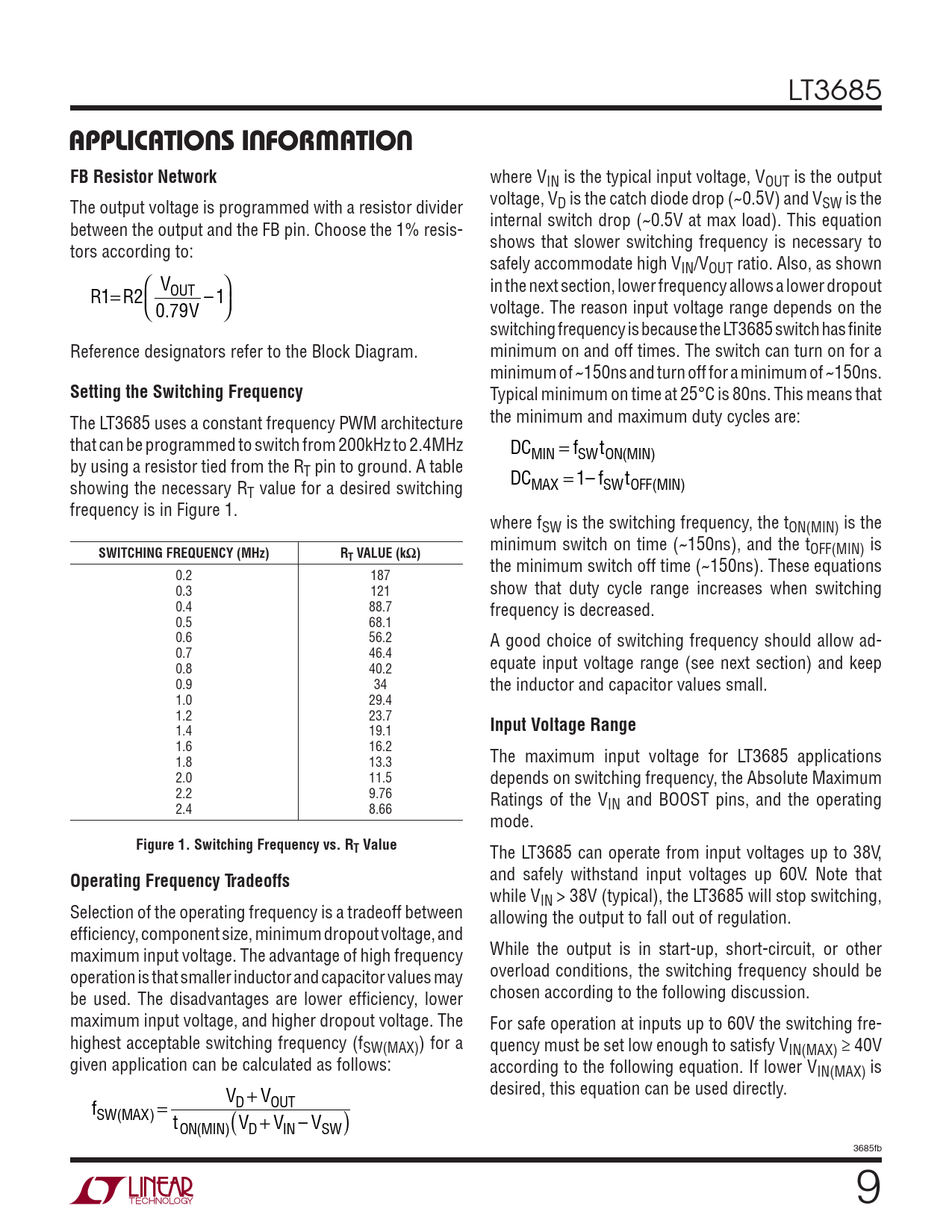 Typical minimum on time at 25°C is 80ns. This means that The LT3685 uses a constant frequency PWM architecture the minimum and maximum duty cycles are: that can be programmed to switch from 200kHz to 2.4MHz DC = f t MIN SW ON M ( IN) by using a resistor tied from the RT pin to ground. A table DC = – 1 f t showing the necessary R MAX SW OFF MIN ( ) T value for a desired switching frequency is in Figure 1. where fSW is the switching frequency, the tON(MIN) is the minimum switch on time (~150ns), and the t