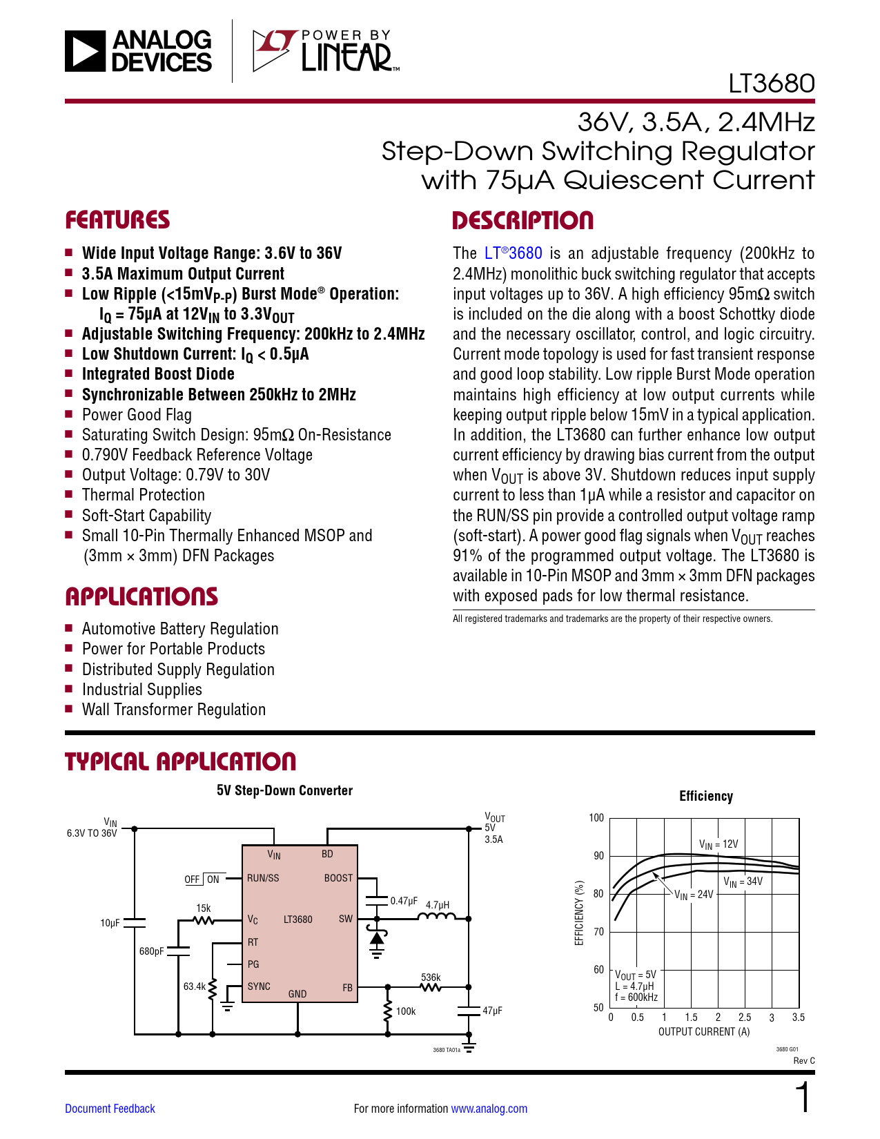 LT3680 36V, 3.5A, 2.4MHz Step-Down Switching Regulator with 75µA Quiescent Current FEATURESDESCRIPTION ■ Wide Input Voltage Range: 3.6V to 36V The LT®3680 is an adjustable frequency (200kHz to ■ 3.5A Maximum Output Current 2.4MHz) monolithic buck switching regulator that accepts ■ Low Ripple (<15mVP-P) Burst Mode® Operation: input voltages up to 36V. A high efficiency 95m switch IQ =75µA at 12VIN to 3.3VOUT is included on the die along with a boost Schottky diode ■ Adjustable Switching Frequency: 200kHz to 2.4MHz and the necessary oscillator, control, and logic circuitry. ■ Low Shutdown Current: IQ < 0.5µA Current mode topology is used for fast transient response ■ Integrated Boost Diode and good loop stability. Low ripple Burst Mode operation ■ Synchronizable Between 250kHz to 2MHz maintains high efficiency at low output currents while ■ Power Good Flag keeping output ripple below 15mV in a typical application. ■ Saturating Switch Design: 95m On-Resistance In addition, the LT3680 can further enhance low output ■ 0.790V Feedback Reference Voltage current efficiency by drawing bias current from the output ■ Output Voltage: 0.79V to 30V when VOUT is above 3V. Shutdown reduces input supply ■ Thermal Protection current to less than 1µA while a resistor and capacitor on ■ Soft-Start Capability the RUN/SS pin provide a controlled output voltage ramp ■ Small 10-Pin Thermally Enhanced MSOP and (soft-start). A power good flag signals when VOUT reaches (3mm × 3mm) DFN Packages 91% of the programmed output voltage. The LT3680 is available in 10-Pin MSOP and 3mm × 3mm DFN packages APPLICATIONS with exposed pads for low thermal resistance. All registered trademarks and trademarks are the property of their respective owners. ■ Automotive Battery Regulation ■ Power for Portable Products ■ Distributed Supply Regulation ■ Industrial Supplies ■ Wall Transformer Regulation TYPICAL APPLICATION5V Step-Down ConverterEfficiency V V 100 IN OUT 6.3V TO 36V 5V 3.5A VIN = 12V VIN BD 90 OFF ON RUN/SS BOOST VIN = 34V 80 0.47µF VIN = 24V 15k 4.7µH VC LT3680 SW 10µF 70 RT EFFICIENCY (%) 680pF PG 60 536k VOUT = 5V 63.4k SYNC FB L = 4.7µH GND f = 600kHz 100k 47µF 50 0 0.5 1 1.5 2 2.5 3 3.5 OUTPUT CURRENT (A) 3680 TA01a 3680 G01 Rev C Document Feedback For more information www.analog.com 1 Document Outline Features Applications Description Typical Application Absolute Maximum Ratings Pin Configuration Order Information Electrical Characteristics Typical Performance Characteristics Pin Functions Block Diagram Operation Applications Information Typical Applications Package Description Revision History Typical Application Related Parts