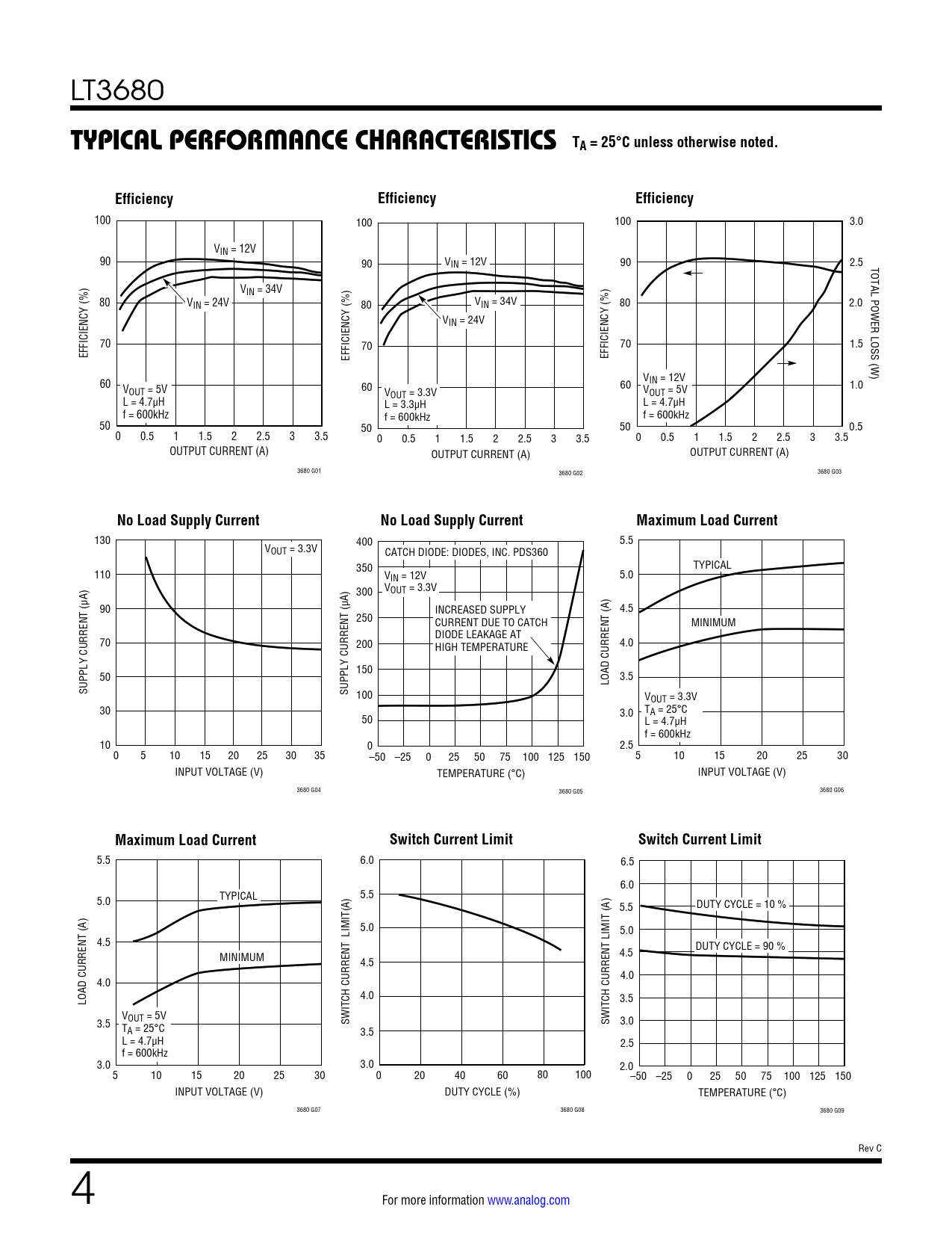 130 5.5 V 400 OUT = 3.3V CATCH DIODE: DIODES, INC. PDS360 350 TYPICAL 110 VIN = 12V 5.0 300 VOUT = 3.3V 90 INCREASED SUPPLY 4.5 250 CURRENT DUE TO CATCH MINIMUM DIODE LEAKAGE AT 70 200 HIGH TEMPERATURE 4.0 150 50 LOAD CURRENT (A) 3.5 SUPPLY CURRENT (µA) SUPPLY CURRENT (µA) 100 VOUT = 3.3V 30 3.0 TA = 25°C 50 L = 4.7µH f = 600kHz 10 0 2.5 0 5 10 15 20 25 30 35 –50 –25 0 25 50 75 100 125 150 5 10 15 20 25 30 INPUT VOLTAGE (V) TEMPERATURE (°C) INPUT VOLTAGE (V) 3680 G04 3680 G05 3680 G06