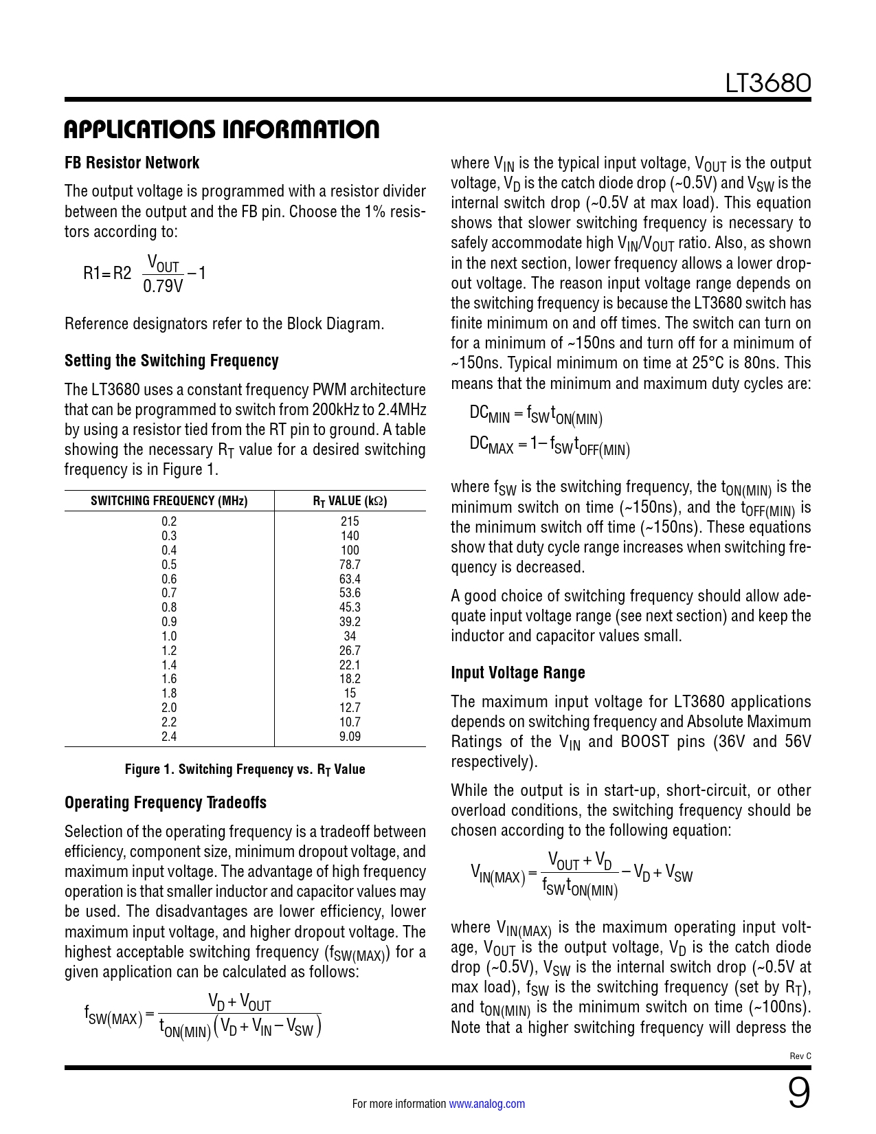 link to page 9 link to page 10 link to page 9 LT3680 APPLICATIONS INFORMATIONFB Resistor Network where VIN is the typical input voltage, VOUT is the output The output voltage is programmed with a resistor divider voltage, VD is the catch diode drop (~0.5V) and VSW is the between the output and the FB pin. Choose the 1% resis- internal switch drop (~0.5V at max load). This equation tors according to: shows that slower switching frequency is necessary to safely accommodate high VIN/VOUT ratio. Also, as shown V R in the next section, lower frequency allows a lower drop- = R OUT 1 2 – 1 out voltage. The reason input voltage range depends on 0 7 . 9V the switching frequency is because the LT3680 switch has Reference designators refer to the Block Diagram. finite minimum on and off times. The switch can turn on for a minimum of ~150ns and turn off for a minimum of Setting the Switching Frequency ~150ns. Typical minimum on time at 25°C is 80ns. This The LT3680 uses a constant frequency PWM architecture means that the minimum and maximum duty cycles are: that can be programmed to switch from 200kHz to 2.4MHz DC = f t MIN SW by using a resistor tied from the RT pin to ground. A table ON MI ( N) showing the necessary R DC = 1– f t T value for a desired switching MAX SW OFF M ( IN) frequency is in Figure 1. where fSW is the switching frequency, the tON(MIN) is the SWITCHING FREQUENCY (MHz)RT VALUE (k Ω ) minimum switch on time (~150ns), and the tOFF(MIN) is 0.2 215 the minimum switch off time (~150ns). These equations 0.3 140 0.4 100 show that duty cycle range increases when switching fre- 0.5 78.7 quency is decreased. 0.6 63.4 0.7 53.6 A good choice of switching frequency should allow ade- 0.8 45.3 0.9 39.2 quate input voltage range (see next section) and keep the 1.0 34 inductor and capacitor values small. 1.2 26.7 1.4 22.1 1.6 18.2 Input Voltage Range 1.8 15 2.0 12.7 The maximum input voltage for LT3680 applications 2.2 10.7 depends on switching frequency and Absolute Maximum 2.4 9.09 Ratings of the VIN and BOOST pins (36V and 56V Figure 1. Switching Frequency vs. R respectively). T Value While the output is in start-up, short-circuit, or other Operating Frequency Tradeoffs overload conditions, the switching frequency should be Selection of the operating frequency is a tradeoff between chosen according to the following equation: efficiency, component size, minimum dropout voltage, and V + V maximum input voltage. The advantage of high frequency V OUT D = – V + V IN MA ( X) D SW operation is that smaller inductor and capacitor values may f t SW ON MI ( N) be used. The disadvantages are lower efficiency, lower maximum input voltage, and higher dropout voltage. The where VIN(MAX) is the maximum operating input volt- highest acceptable switching frequency (f age, V SW(MAX)) for a OUT is the output voltage, VD is the catch diode given application can be calculated as follows: drop (~0.5V), VSW is the internal switch drop (~0.5V at max load), f V SW is the switching frequency (set by RT), + V f D OUT and t SW MA ( X) = ON(MIN) is the minimum switch on time (~100ns). t (V + V – V ) Note that a higher switching frequency will depress the ON MI ( N) D IN SW Rev C For more information www.analog.com 9 Document Outline Features Applications Description Typical Application Absolute Maximum Ratings Pin Configuration Order Information Electrical Characteristics Typical Performance Characteristics Pin Functions Block Diagram Operation Applications Information Typical Applications Package Description Revision History Typical Application Related Parts