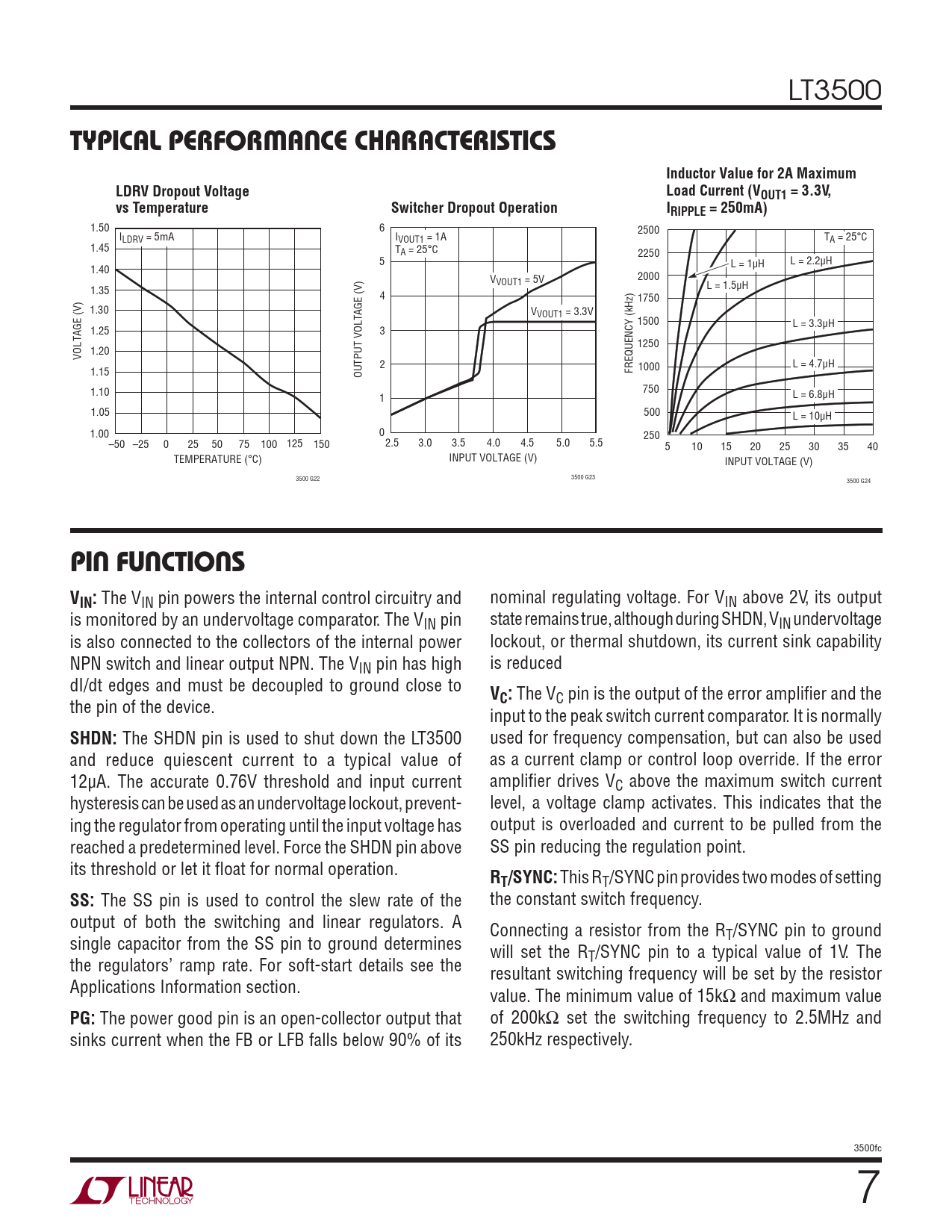 The power good pin is an open-collector output that of 200kΩ set the switching frequency to 2.5MHz and sinks current when the FB or LFB falls below 90% of its 250kHz respectively. 3500fc 7