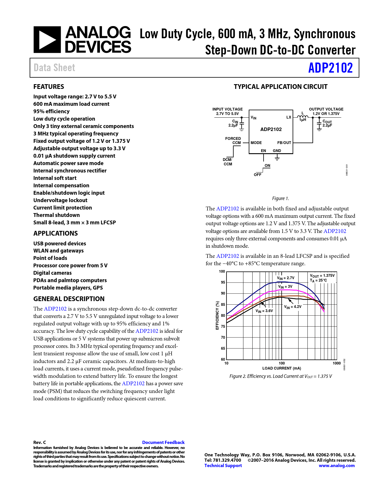 Low Duty Cycle, 600 mA, 3 MHz, Synchronous. Step-Down DC-to-DC Converter. Data Sheet. ADP2102. FEATURES