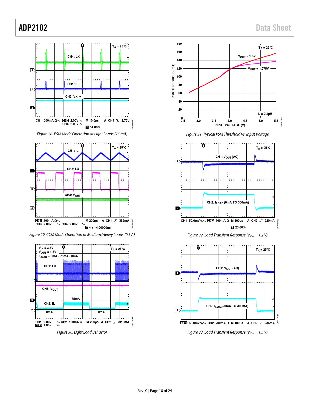 06631- 06631- Figure 28. PSM Mode Operation at Light Loads (75 mA) Figure 31. Typical PSM Threshold vs. Input Voltage