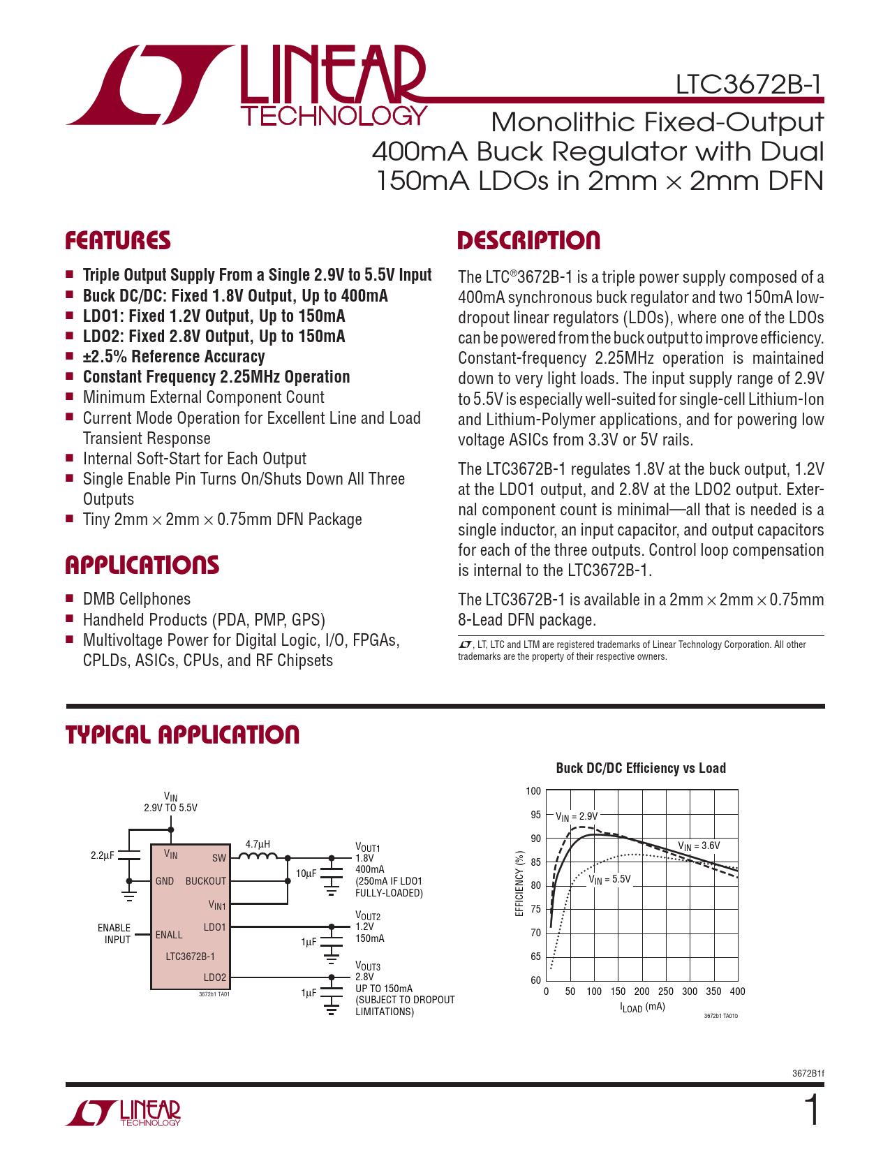is internal to the LTC3672B-1. ■ DMB Cellphones The LTC3672B-1 is available in a 2mm × 2mm × 0.75mm ■ Handheld Products (PDA, PMP, GPS) 8-Lead DFN package. ■ Multivoltage Power for Digital Logic, I/O, FPGAs, L, LT, LTC and LTM are registered trademarks of Linear Technology Corporation. All other CPLDs, ASICs, CPUs, and RF Chipsets trademarks are the property of their respective owners.
