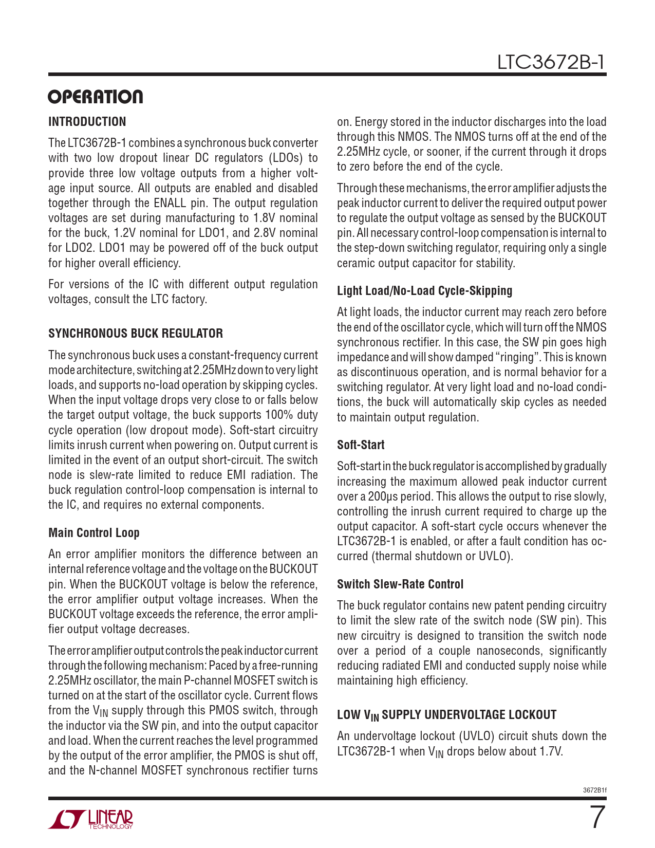 the inductor via the SW pin, and into the output capacitor and load. When the current reaches the level programmed An undervoltage lockout (UVLO) circuit shuts down the by the output of the error amplifi er, the PMOS is shut off, LTC3672B-1 when VIN drops below about 1.7V. and the N-channel MOSFET synchronous rectifi er turns 3672B1f 7