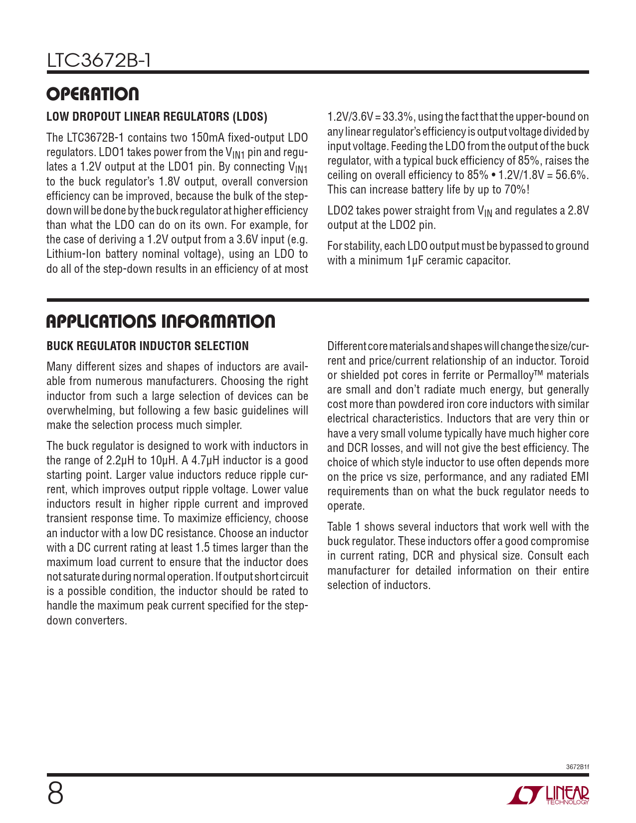 LTC3672B-1 OPERATIONLOW DROPOUT LINEAR REGULATORS (LDOS) 1.2V/3.6V = 33.3%, using the fact that the upper-bound on any linear regulator’s effi ciency is output voltage divided by The LTC3672B-1 contains two 150mA fi xed-output LDO input voltage. Feeding the LDO from the output of the buck regulators. LDO1 takes power from the VIN1 pin and regu- regulator, with a typical buck effi ciency of 85%, raises the lates a 1.2V output at the LDO1 pin. By connecting VIN1 ceiling on overall effi ciency to 85% • 1.2V/1.8V = 56.6%. to the buck regulator’s 1.8V output, overall conversion This can increase battery life by up to 70%! effi ciency can be improved, because the bulk of the step- down will be done by the buck regulator at higher effi ciency LDO2 takes power straight from VIN and regulates a 2.8V than what the LDO can do on its own. For example, for output at the LDO2 pin. the case of deriving a 1.2V output from a 3.6V input (e.g. For stability, each LDO output must be bypassed to ground Lithium-Ion battery nominal voltage), using an LDO to with a minimum 1μF ceramic capacitor. do all of the step-down results in an effi ciency of at most APPLICATIONS INFORMATIONBUCK REGULATOR INDUCTOR SELECTION Different core materials and shapes will change the size/cur- rent and price/current relationship of an inductor. Toroid Many different sizes and shapes of inductors are avail- or shielded pot cores in ferrite or Permalloy™ materials able from numerous manufacturers. Choosing the right are small and don’t radiate much energy, but generally inductor from such a large selection of devices can be cost more than powdered iron core inductors with similar overwhelming, but following a few basic guidelines will electrical characteristics. Inductors that are very thin or make the selection process much simpler. have a very small volume typically have much higher core The buck regulator is designed to work with inductors in and DCR losses, and will not give the best effi ciency. The the range of 2.2μH to 10μH. A 4.7μH inductor is a good choice of which style inductor to use often depends more starting point. Larger value inductors reduce ripple cur- on the price vs size, performance, and any radiated EMI rent, which improves output ripple voltage. Lower value requirements than on what the buck regulator needs to inductors result in higher ripple current and improved operate. transient response time. To maximize effi ciency, choose Table 1 shows several inductors that work well with the an inductor with a low DC resistance. Choose an inductor buck regulator. These inductors offer a good compromise with a DC current rating at least 1.5 times larger than the in current rating, DCR and physical size. Consult each maximum load current to ensure that the inductor does manufacturer for detailed information on their entire not saturate during normal operation. If output short circuit selection of inductors. is a possible condition, the inductor should be rated to handle the maximum peak current specifi ed for the step- down converters. 3672B1f 8