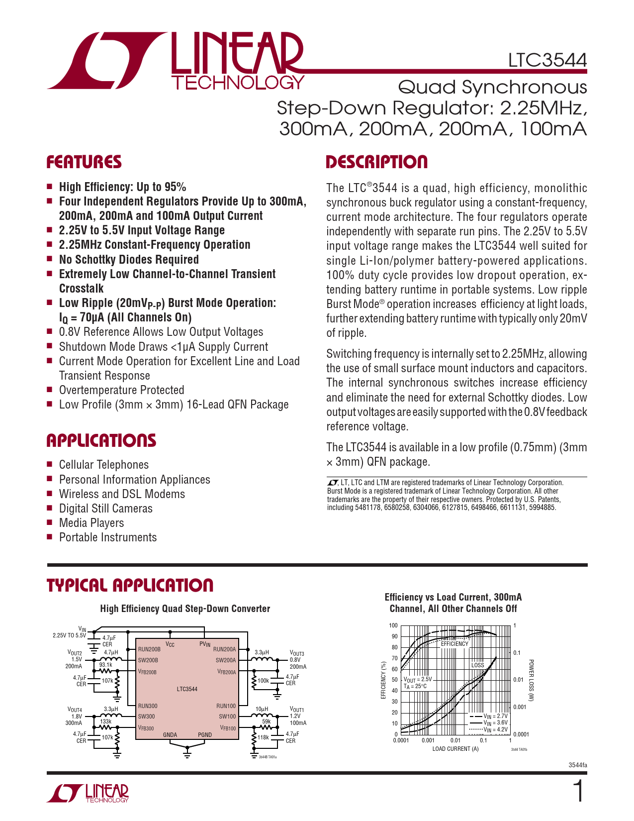 LTC3544 Quad Synchronous Step-Down Regulator: 2.25MHz, 300mA, 200mA, 200mA, 100mA FEATURESDESCRIPTION ■ High Effi ciency: Up to 95% The LTC®3544 is a quad, high efficiency, monolithic ■ Four Independent Regulators Provide Up to 300mA, synchronous buck regulator using a constant-frequency, 200mA, 200mA and 100mA Output Current current mode architecture. The four regulators operate ■ 2.25V to 5.5V Input Voltage Range independently with separate run pins. The 2.25V to 5.5V ■ 2.25MHz Constant-Frequency Operation input voltage range makes the LTC3544 well suited for ■ No Schottky Diodes Required single Li-Ion/polymer battery-powered applications. ■ Extremely Low Channel-to-Channel Transient 100% duty cycle provides low dropout operation, ex- Crosstalk tending battery runtime in portable systems. Low ripple ■ Low Ripple (20mVP-P) Burst Mode Operation: Burst Mode® operation increases effi ciency at light loads, IQ = 70μA (All Channels On) further extending battery runtime with typically only 20mV ■ 0.8V Reference Allows Low Output Voltages of ripple. ■ Shutdown Mode Draws <1μA Supply Current Switching frequency is internally set to 2.25MHz, allowing ■ Current Mode Operation for Excellent Line and Load the use of small surface mount inductors and capacitors. Transient Response The internal synchronous switches increase effi ciency ■ Overtemperature Protected and eliminate the need for external Schottky diodes. Low ■ Low Profi le (3mm × 3mm) 16-Lead QFN Package output voltages are easily supported with the 0.8V feedback reference voltage. APPLICATIONS The LTC3544 is available in a low profi le (0.75mm) (3mm ■ Cellular Telephones × 3mm) QFN package. ■ Personal Information Appliances , LT, LTC and LTM are registered trademarks of Linear Technology Corporation. ■ Wireless and DSL Modems Burst Mode is a registered trademark of Linear Technology Corporation. All other trademarks are the property of their respective owners. Protected by U.S. Patents, ■ Digital Still Cameras including 5481178, 6580258, 6304066, 6127815, 6498466, 6611131, 5994885. ■ Media Players ■ Portable Instruments TYPICAL APPLICATIONEffi ciency vs Load Current, 300mAHigh Effi ciency Quad Step-Down ConverterChannel, All Other Channels Off 100 1 VIN 2.25V TO 5.5V 4.7μF 90 CER VCC PVIN EFFICIENCY 80 V RUN200B RUN200A OUT2 4.7μH 3.3μH VOUT3 0.1 1.5V POWER LOSS (W) SW200B SW200A 0.8V 70 200mA 93.1k 200mA LOSS V 60 FB200B VFB200A 4.7μF 4.7μF 107k 100k 50 VOUT = 2.5V 0.01 CER CER T LTC3544 A = 25°C 40 EFFICIENCY (%) 30 RUN300 RUN100 V 3.3 0.001 OUT4 μH 10μH VOUT1 20 1.8V SW300 SW100 1.2V VIN = 2.7V 133k 59k 300mA 100mA 10 VIN = 3.6V VFB300 VFB100 VIN = 4.2V 4.7μF GNDA PGND 4.7μF 0 0.0001 107k 118k CER CER 0.0001 0.001 0.01 0.1 1 LOAD CURRENT (A) 3544 TA01b 3544B TA01a 3544fa 1