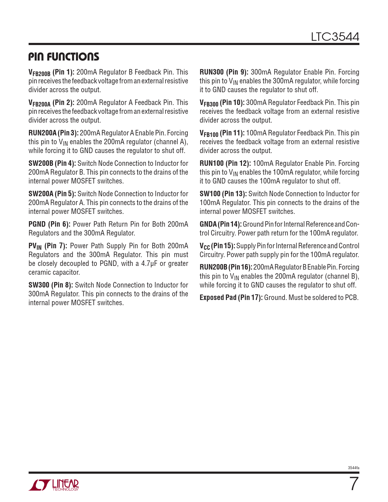 PIN FUNCTIONS. VFB200B (Pin 1):. RUN300 (Pin 9):. VFB200A (Pin 2):. VFB300 (Pin 10):. RUN200A (Pin 3):. VFB100 (Pin 11):