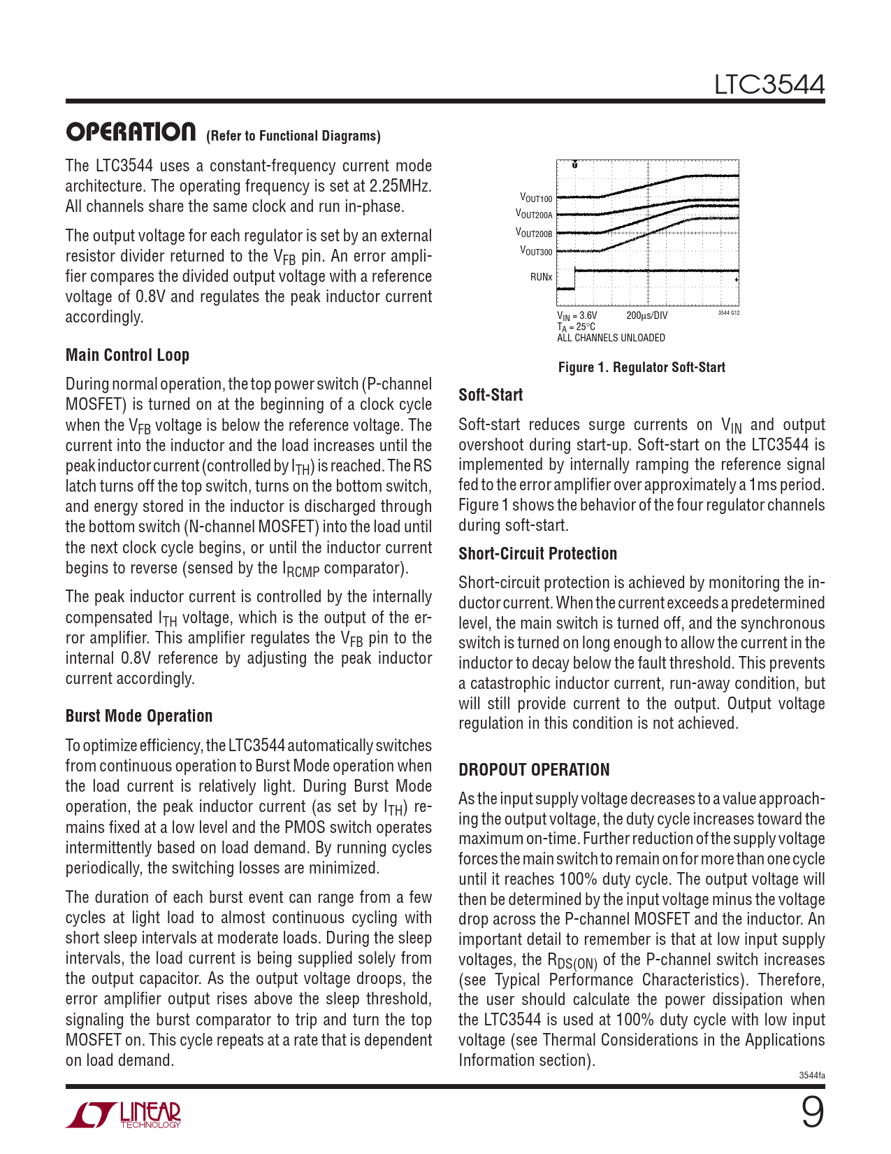LTC3544 OPERATION (Refer to Functional Diagrams) The LTC3544 uses a constant-frequency current mode architecture. The operating frequency is set at 2.25MHz. V All channels share the same clock and run in-phase. OUT100 VOUT200A The output voltage for each regulator is set by an external VOUT200B resistor divider returned to the V VOUT300 FB pin. An error ampli- fi er compares the divided output voltage with a reference RUNx voltage of 0.8V and regulates the peak inductor current accordingly. V 200 3544 G12 IN = 3.6V μs/DIV TA = 25°C ALL CHANNELS UNLOADED Main Control LoopFigure 1. Regulator Soft-Start During normal operation, the top power switch (P-channel Soft-Start MOSFET) is turned on at the beginning of a clock cycle when the VFB voltage is below the reference voltage. The Soft-start reduces surge currents on VIN and output current into the inductor and the load increases until the overshoot during start-up. Soft-start on the LTC3544 is peak inductor current (controlled by ITH) is reached. The RS implemented by internally ramping the reference signal latch turns off the top switch, turns on the bottom switch, fed to the error amplifi er over approximately a 1ms period. and energy stored in the inductor is discharged through Figure 1 shows the behavior of the four regulator channels the bottom switch (N-channel MOSFET) into the load until during soft-start. the next clock cycle begins, or until the inductor current Short-Circuit Protection begins to reverse (sensed by the IRCMP comparator). Short-circuit protection is achieved by monitoring the in- The peak inductor current is controlled by the internally ductor current. When the current exceeds a predetermined compensated ITH voltage, which is the output of the er- level, the main switch is turned off, and the synchronous ror amplifi er. This amplifi er regulates the VFB pin to the switch is turned on long enough to allow the current in the internal 0.8V reference by adjusting the peak inductor inductor to decay below the fault threshold. This prevents current accordingly. a catastrophic inductor current, run-away condition, but will still provide current to the output. Output voltage Burst Mode Operation regulation in this condition is not achieved. To optimize effi ciency, the LTC3544 automatically switches from continuous operation to Burst Mode operation when DROPOUT OPERATION the load current is relatively light. During Burst Mode operation, the peak inductor current (as set by I As the input supply voltage decreases to a value approach- TH) re- mains fi xed at a low level and the PMOS switch operates ing the output voltage, the duty cycle increases toward the maximum on-time. Further reduction of the supply voltage intermittently based on load demand. By running cycles forces the main switch to remain on for more than one cycle periodically, the switching losses are minimized. until it reaches 100% duty cycle. The output voltage will The duration of each burst event can range from a few then be determined by the input voltage minus the voltage cycles at light load to almost continuous cycling with drop across the P-channel MOSFET and the inductor. An short sleep intervals at moderate loads. During the sleep important detail to remember is that at low input supply intervals, the load current is being supplied solely from voltages, the RDS(ON) of the P-channel switch increases the output capacitor. As the output voltage droops, the (see Typical Performance Characteristics). Therefore, error amplifi er output rises above the sleep threshold, the user should calculate the power dissipation when signaling the burst comparator to trip and turn the top the LTC3544 is used at 100% duty cycle with low input MOSFET on. This cycle repeats at a rate that is dependent voltage (see Thermal Considerations in the Applications on load demand. Information section). 3544fa 9