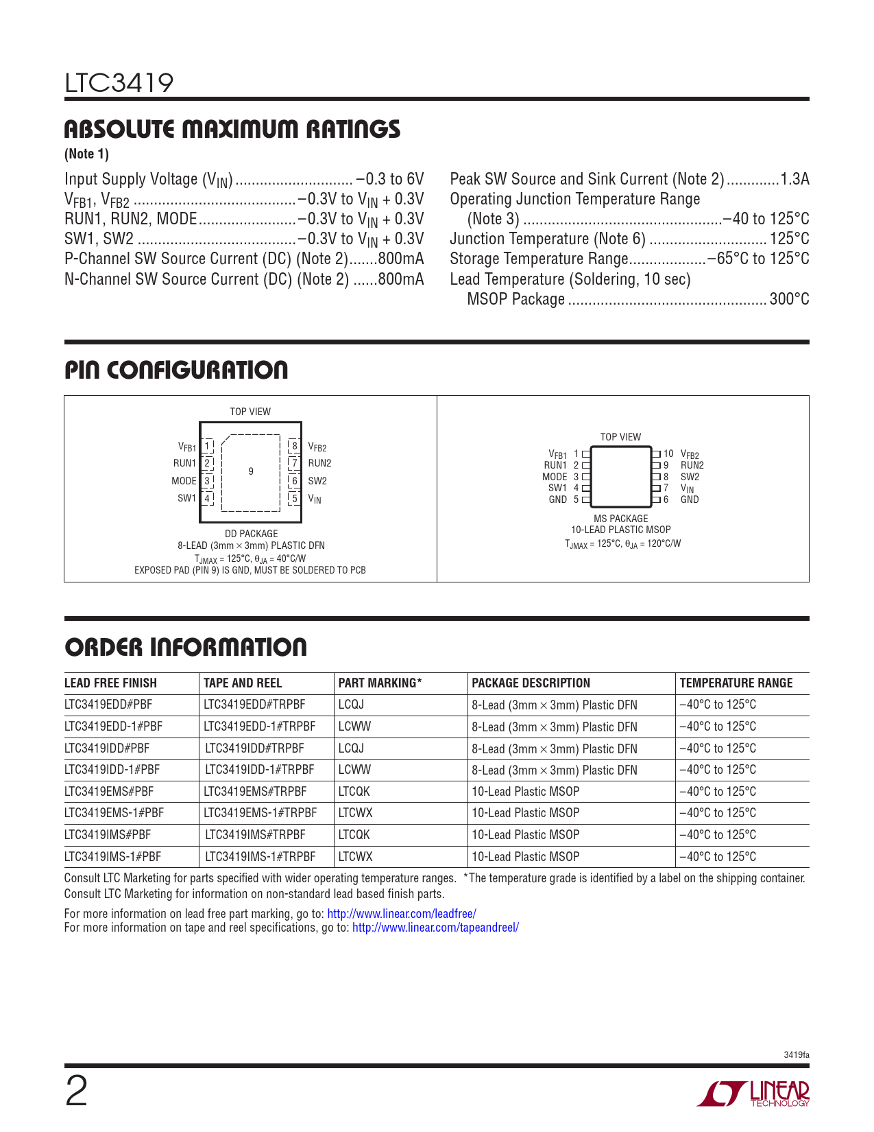 LTC3419 ABSOLUTE MAXIMUM RATINGS(Note 1) Input Supply Voltage (VIN) ... –0.3 to 6V Peak SW Source and Sink Current (Note 2) ...1.3A VFB1, VFB2 .. –0.3V to VIN + 0.3V Operating Junction Temperature Range RUN1, RUN2, MODE .. –0.3V to VIN + 0.3V (Note 3) ...–40 to 125°C SW1, SW2 ... –0.3V to VIN + 0.3V Junction Temperature (Note 6) ... 125°C P-Channel SW Source Current (DC) (Note 2) ...800mA Storage Temperature Range ...–65°C to 125°C N-Channel SW Source Current (DC) (Note 2) ..800mA Lead Temperature (Soldering, 10 sec) MSOP Package ... 300°C PIN CONFIGURATION TOP VIEW TOP VIEW V 1 8 FB1 VFB2 V 1 FB1 10 VFB2 RUN1 2 7 RUN2 RUN1 2 9 RUN2 9 MODE 3 6 SW2 MODE 3 8 SW2 SW1 4 7 VIN SW1 4 5 VIN GND 5 6 GND MS PACKAGE DD PACKAGE 10-LEAD PLASTIC MSOP 8-LEAD (3mm s 3mm) PLASTIC DFN TJMAX = 125°C, θJA = 120°C/W TJMAX = 125°C, θJA = 40°C/W EXPOSED PAD (PIN 9) IS GND, MUST BE SOLDERED TO PCB ORDER INFORMATIONLEAD FREE FINISHTAPE AND REELPART MARKING*PACKAGE DESCRIPTIONTEMPERATURE RANGE LTC3419EDD#PBF LTC3419EDD#TRPBF LCQJ 8-Lead (3mm × 3mm) Plastic DFN –40°C to 125°C LTC3419EDD-1#PBF LTC3419EDD-1#TRPBF LCWW 8-Lead (3mm × 3mm) Plastic DFN –40°C to 125°C LTC3419IDD#PBF LTC3419IDD#TRPBF LCQJ 8-Lead (3mm × 3mm) Plastic DFN –40°C to 125°C LTC3419IDD-1#PBF LTC3419IDD-1#TRPBF LCWW 8-Lead (3mm × 3mm) Plastic DFN –40°C to 125°C LTC3419EMS#PBF LTC3419EMS#TRPBF LTCQK 10-Lead Plastic MSOP –40°C to 125°C LTC3419EMS-1#PBF LTC3419EMS-1#TRPBF LTCWX 10-Lead Plastic MSOP –40°C to 125°C LTC3419IMS#PBF LTC3419IMS#TRPBF LTCQK 10-Lead Plastic MSOP –40°C to 125°C LTC3419IMS-1#PBF LTC3419IMS-1#TRPBF LTCWX 10-Lead Plastic MSOP –40°C to 125°C Consult LTC Marketing for parts specifi ed with wider operating temperature ranges. *The temperature grade is identifi ed by a label on the shipping container. Consult LTC Marketing for information on non-standard lead based fi nish parts. For more information on lead free part marking, go to: http://www.linear.com/leadfree/ For more information on tape and reel specifi cations, go to: http://www.linear.com/tapeandreel/ 3419fa 2