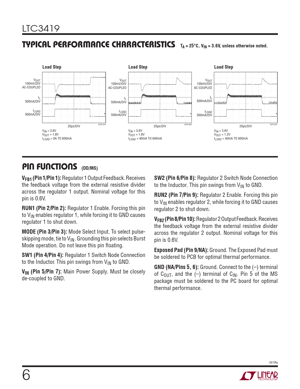 LTC3419 TYPICAL PERFORMANCE CHARACTERISTICS TA = 25°C, VIN = 3.6V, unless otherwise noted.Load StepLoad StepLoad Step VOUT VOUT VOUT 100mV/DIV 100mV/DIV 100mV/DIV AC-COUPLED AC-COUPLED AC-COUPLED IL I I L L 500mA/DIV 500mA/DIV 500mA/DIV ILOAD ILOAD ILOAD 500mA/DIV 500mA/DIV 500mA/DIV 3419 G19 3419 G20 3419 G21 20μs/DIV 20μs/DIV 20μs/DIV VIN = 3.6V VIN = 3.6V VIN = 3.6V VOUT = 1.8V VOUT = 1.8V VOUT = 1.2V ILOAD = 0A TO 600mA ILOAD = 40mA TO 600mA ILOAD = 40mA TO 600mA PIN FUNCTIONS (DD/MS)VFB1 (Pin 1/Pin 1): Regulator 1 Output Feedback. Receives SW2 (Pin 6/Pin 8): Regulator 2 Switch Node Connection the feedback voltage from the external resistive divider to the Inductor. This pin swings from VIN to GND. across the regulator 1 output. Nominal voltage for this RUN2 (Pin 7/Pin 9): Regulator 2 Enable. Forcing this pin pin is 0.6V. to VIN enables regulator 2, while forcing it to GND causes RUN1 (Pin 2/Pin 2): Regulator 1 Enable. Forcing this pin regulator 2 to shut down. to VIN enables regulator 1, while forcing it to GND causes V regulator 1 to shut down. FB2 (Pin 8/Pin 10): Regulator 2 Output Feedback. Receives the feedback voltage from the external resistive divider MODE (Pin 3/Pin 3): Mode Select Input. To select pulse- across the regulator 2 output. Nominal voltage for this skipping mode, tie to VIN. Grounding this pin selects Burst pin is 0.6V. Mode operation. Do not leave this pin fl oating. Exposed Pad (Pin 9/NA): Ground. The Exposed Pad must SW1 (Pin 4/Pin 4): Regulator 1 Switch Node Connection be soldered to PCB for optimal thermal performance. to the Inductor. This pin swings from VIN to GND. GND (NA/Pins 5, 6): Ground. Connect to the (–) terminal VIN (Pin 5/Pin 7): Main Power Supply. Must be closely of COUT, and the (–) terminal of CIN. Pin 5 of the MS de-coupled to GND. package must be soldered to the PC board for optimal thermal performance. 3419fa 6