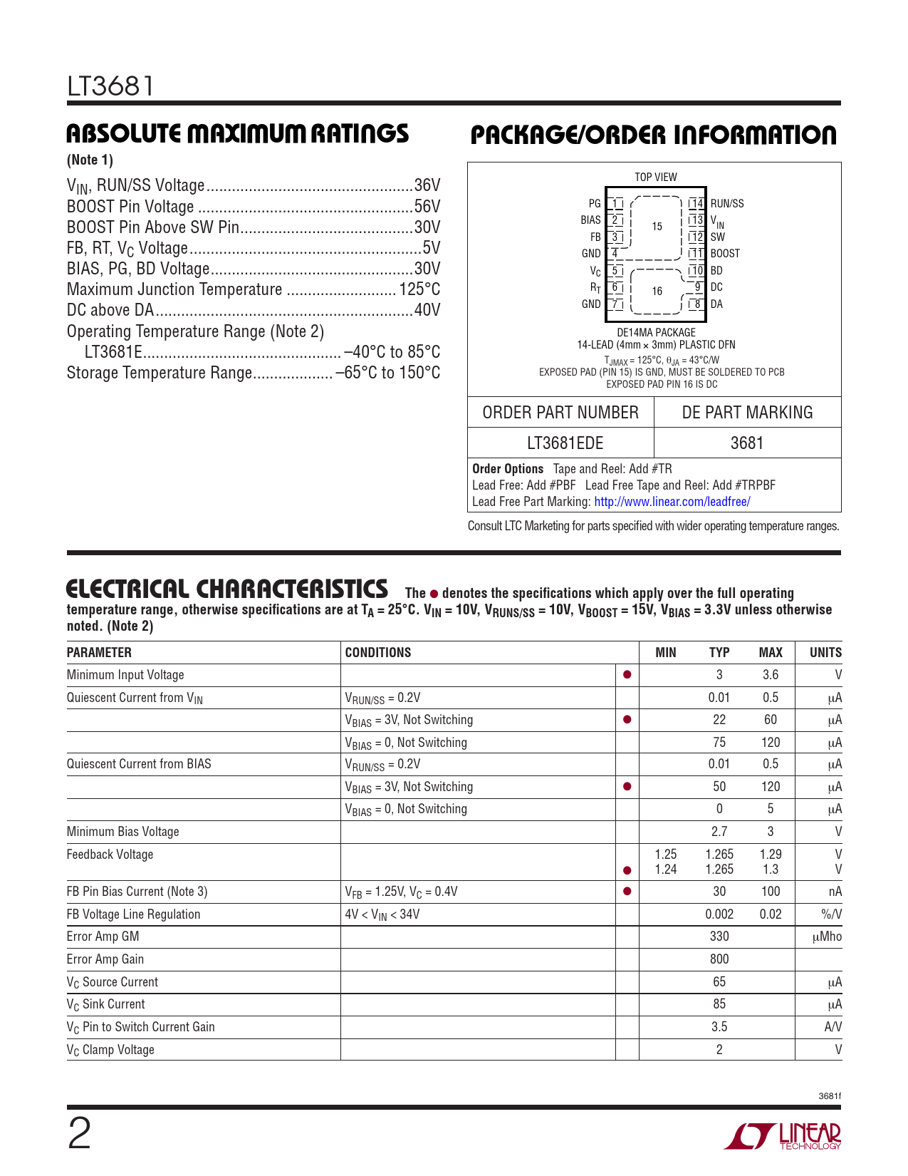 LT3681 WWWUUWUABSOLUTE AXI URATI GSPACKAGE/ORDER I FOR ATIO(Note 1) TOP VIEW VIN, RUN/SS Voltage ...36V BOOST Pin Voltage ...56V PG 1 14 RUN/SS BOOST Pin Above SW Pin ...30V BIAS 2 13 VIN 15 FB 3 12 SW FB, RT, VC Voltage ...5V GND 4 11 BOOST BIAS, PG, BD Voltage ..30V V 5 10 BD C Maximum Junction Temperature .. 125°C R 6 9 DC T 16 DC above DA ...40V GND 7 8 DA Operating Temperature Range (Note 2) DE14MA PACKAGE LT3681E ... –40°C to 85°C 14-LEAD (4mm ´ 3mm) PLASTIC DFN TJMAX = 125°C, θJA = 43°C/W Storage Temperature Range ... –65°C to 150°C EXPOSED PAD (PIN 15) IS GND, MUST BE SOLDERED TO PCB EXPOSED PAD PIN 16 IS DC ORDER PART NUMBER DE PART MARKING LT3681EDE 3681 Order Options Tape and Reel: Add #TR Lead Free: Add #PBF Lead Free Tape and Reel: Add #TRPBF Lead Free Part Marking: http://www.linear.com/leadfree/ Consult LTC Marketing for parts specifi ed with wider operating temperature ranges. ELECTRICAL CHARACTERISTICSThe ● denotes the specifi cations which apply over the full operatingtemperature range, otherwise specifi cations are at TA = 25°C. VIN = 10V, VRUNS/SS = 10V, VBOOST = 15V, VBIAS = 3.3V unless otherwise noted. (Note 2)PARAMETERCONDITIONSMINTYPMAXUNITS Minimum Input Voltage ● 3 3.6 V Quiescent Current from VIN VRUN/SS = 0.2V 0.01 0.5 μA VBIAS = 3V, Not Switching ● 22 60 μA VBIAS = 0, Not Switching 75 120 μA Quiescent Current from BIAS VRUN/SS = 0.2V 0.01 0.5 μA VBIAS = 3V, Not Switching ● 50 120 μA VBIAS = 0, Not Switching 0 5 μA Minimum Bias Voltage 2.7 3 V Feedback Voltage 1.25 1.265 1.29 V ● 1.24 1.265 1.3 V FB Pin Bias Current (Note 3) VFB = 1.25V, VC = 0.4V ● 30 100 nA FB Voltage Line Regulation 4V < VIN < 34V 0.002 0.02 %/V Error Amp GM 330 μMho Error Amp Gain 800 VC Source Current 65 μA VC Sink Current 85 μA VC Pin to Switch Current Gain 3.5 A/V VC Clamp Voltage 2 V 3681f 2