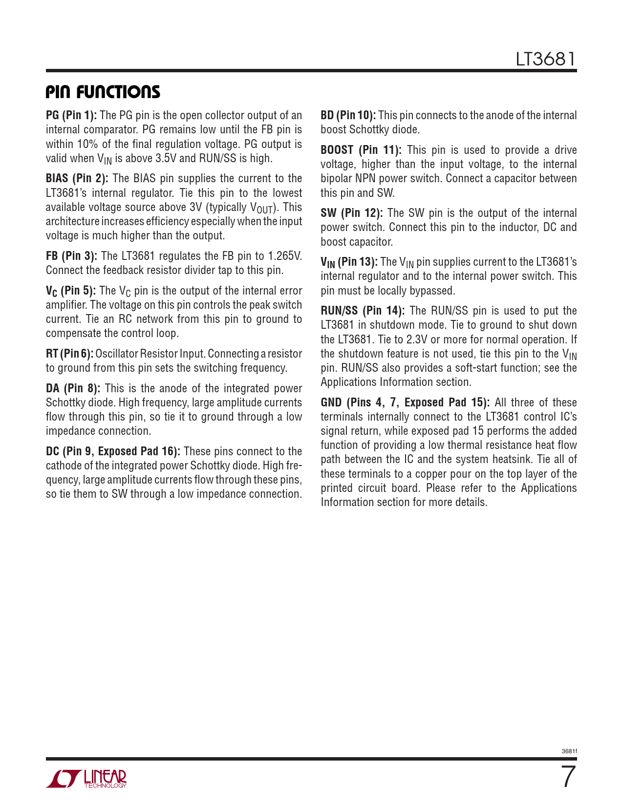 These pins connect to the path between the IC and the system heatsink. Tie all of cathode of the integrated power Schottky diode. High fre- these terminals to a copper pour on the top layer of the quency, large amplitude currents fl ow through these pins, printed circuit board. Please refer to the Applications so tie them to SW through a low impedance connection. Information section for more details. 3681f 7