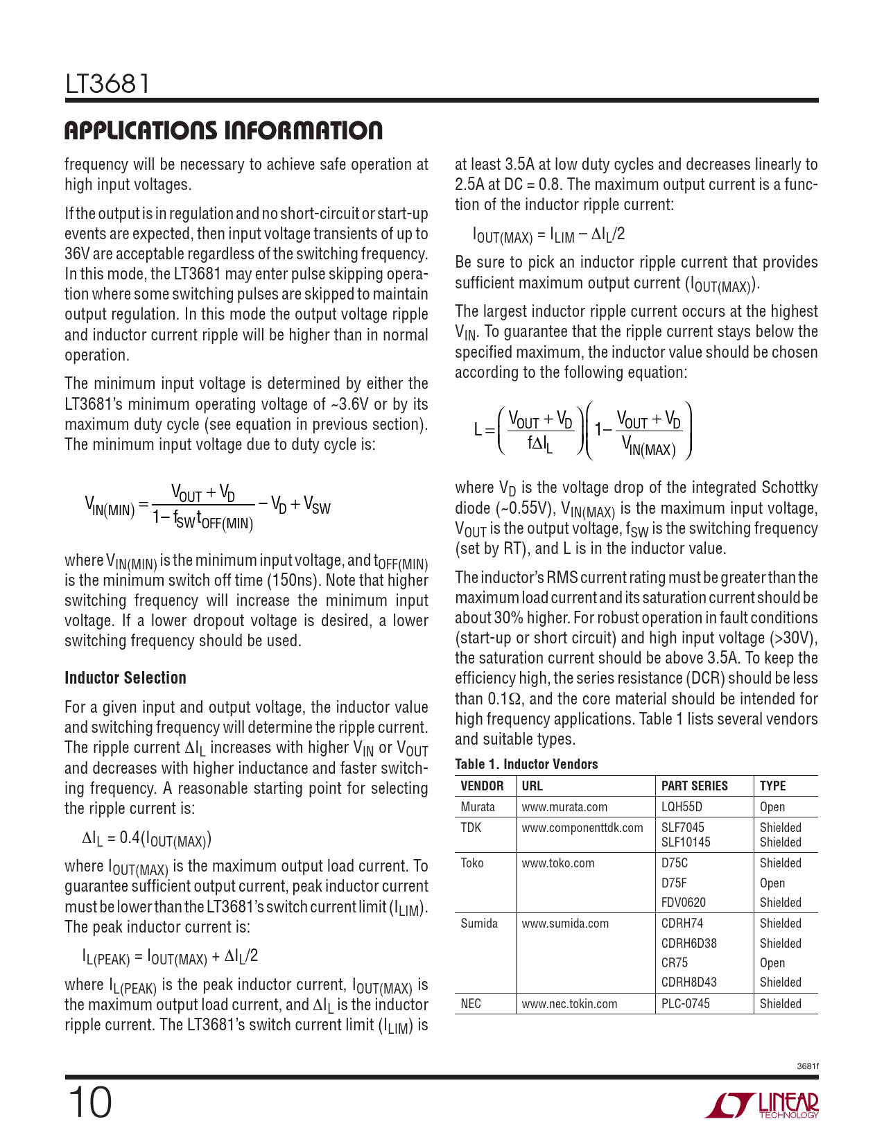 frequency will be necessary to achieve safe operation at at least 3.5A at low duty cycles and decreases linearly to high input voltages. 2.5A at DC = 0.8. The maximum output current is a func- tion of the inductor ripple current: If the output is in regulation and no short-circuit or start-up events are expected, then input voltage transients of up to IOUT(MAX) = ILIM – ΔIL/2 36V are acceptable regardless of the switching frequency. Be sure to pick an inductor ripple current that provides In this mode, the LT3681 may enter pulse skipping opera- suffi cient maximum output current (I tion where some switching pulses are skipped to maintain OUT(MAX)). output regulation. In this mode the output voltage ripple The largest inductor ripple current occurs at the highest and inductor current ripple will be higher than in normal VIN. To guarantee that the ripple current stays below the operation. specifi ed maximum, the inductor value should be chosen according to the following equation: The minimum input voltage is determined by either the LT3681’s minimum operating voltage of ~3.6V or by its ⎛ ⎞ ⎛ ⎞ maximum duty cycle (see equation in previous section). V + V V + V L OUT D OUT D = ⎜1– ⎟ The minimum input voltage due to duty cycle is: ⎝⎜ f I ∆ ⎠⎟ ⎜ V ⎟ L ⎝ IN MA ( X) ⎠ V + V where VD is the voltage drop of the integrated Schottky V OUT D = – V + V IN MIN diode (~0.55V), V 1– f t D SW ( ) IN(MAX) is the maximum input voltage, SW ( ) OFF MIN VOUT is the output voltage, fSW is the switching frequency (set by RT), and L is in the inductor value. where VIN(MIN) is the minimum input voltage, and tOFF(MIN) is the minimum switch off time (150ns). Note that higher The inductor’s RMS current rating must be greater than the switching frequency will increase the minimum input maximum load current and its saturation current should be voltage. If a lower dropout voltage is desired, a lower about 30% higher. For robust operation in fault conditions switching frequency should be used. (start-up or short circuit) and high input voltage (>30V), the saturation current should be above 3.5A. To keep the