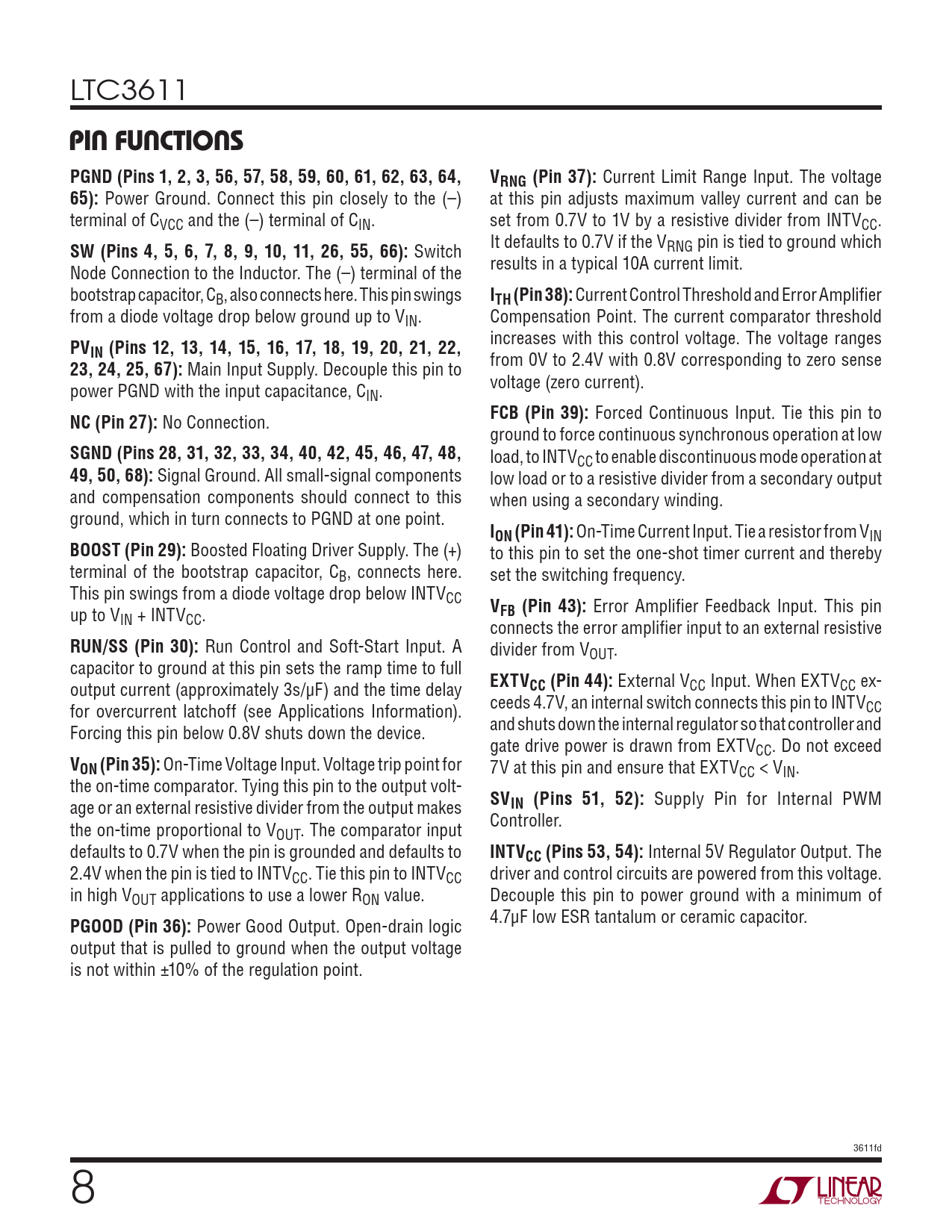 LTC3611 pin Functions PGND (Pins 1, 2, 3, 56, 57, 58, 59, 60, 61, 62, 63, 64,VRNG (Pin 37): Current Limit Range Input. The voltage 65): Power Ground. Connect this pin closely to the (–) at this pin adjusts maximum val ey current and can be terminal of CVCC and the (–) terminal of CIN. set from 0.7V to 1V by a resistive divider from INTVCC. SW (Pins 4, 5, 6, 7, 8, 9, 10, 11, 26, 55, 66): Switch It defaults to 0.7V if the VRNG pin is tied to ground which Node Connection to the Inductor. The (–) terminal of the results in a typical 10A current limit. bootstrap capacitor, CB, also connects here. This pin swings ITH (Pin 38): Current Control Threshold and Error Amplifier from a diode voltage drop below ground up to VIN. Compensation Point. The current comparator threshold PV increases with this control voltage. The voltage ranges IN (Pins 12, 13, 14, 15, 16, 17, 18, 19, 20, 21, 22,23, 24, 25, 67): Main Input Supply. Decouple this pin to from 0V to 2.4V with 0.8V corresponding to zero sense power PGND with the input capacitance, C voltage (zero current). IN. NC (Pin 27): No Connection. FCB (Pin 39): Forced Continuous Input. Tie this pin to ground to force continuous synchronous operation at low SGND (Pins 28, 31, 32, 33, 34, 40, 42, 45, 46, 47, 48, load, to INTVCC to enable discontinuous mode operation at 49, 50, 68): Signal Ground. All smal -signal components low load or to a resistive divider from a secondary output and compensation components should connect to this when using a secondary winding. ground, which in turn connects to PGND at one point. ION (Pin 41): On-Time Current Input. Tie a resistor from VIN BOOST (Pin 29): Boosted Floating Driver Supply. The (+) to this pin to set the one-shot timer current and thereby terminal of the bootstrap capacitor, CB, connects here. set the switching frequency. This pin swings from a diode voltage drop below INTVCC up to V VFB (Pin 43): Error Amplifier Feedback Input. This pin IN + INTVCC. connects the error amplifier input to an external resistive RUN/SS (Pin 30): Run Control and Soft-Start Input. A divider from VOUT. capacitor to ground at this pin sets the ramp time to full output current (approximately 3s/μF) and the time delay EXTVCC (Pin 44): External VCC Input. When EXTVCC ex- for overcurrent latchoff (see Applications Information). ceeds 4.7V, an internal switch connects this pin to INTVCC Forcing this pin below 0.8V shuts down the device. and shuts down the internal regulator so that control er and gate drive power is drawn from EXTVCC. Do not exceed VON (Pin 35): On-Time Voltage Input. Voltage trip point for 7V at this pin and ensure that EXTVCC < VIN. the on-time comparator. Tying this pin to the output volt- age or an external resistive divider from the output makes SVIN (Pins 51, 52): Supply Pin for Internal PWM the on-time proportional to V Control er. OUT. The comparator input defaults to 0.7V when the pin is grounded and defaults to INTVCC (Pins 53, 54): Internal 5V Regulator Output. The 2.4V when the pin is tied to INTVCC. Tie this pin to INTVCC driver and control circuits are powered from this voltage. in high VOUT applications to use a lower RON value. Decouple this pin to power ground with a minimum of PGOOD (Pin 36): Power Good Output. Open-drain logic 4.7μF low ESR tantalum or ceramic capacitor. output that is pul ed to ground when the output voltage is not within ±10% of the regulation point. 3611fd Document Outline Features Applications Description Typical Application Absolute Maximum Ratings Pin Configuration order information Electrical Characteristics Typical Performance Characteristics Pin Functions Functional Diagram Operation Applications Information Typical Applications Package Description Revision History Typical Application Related Parts