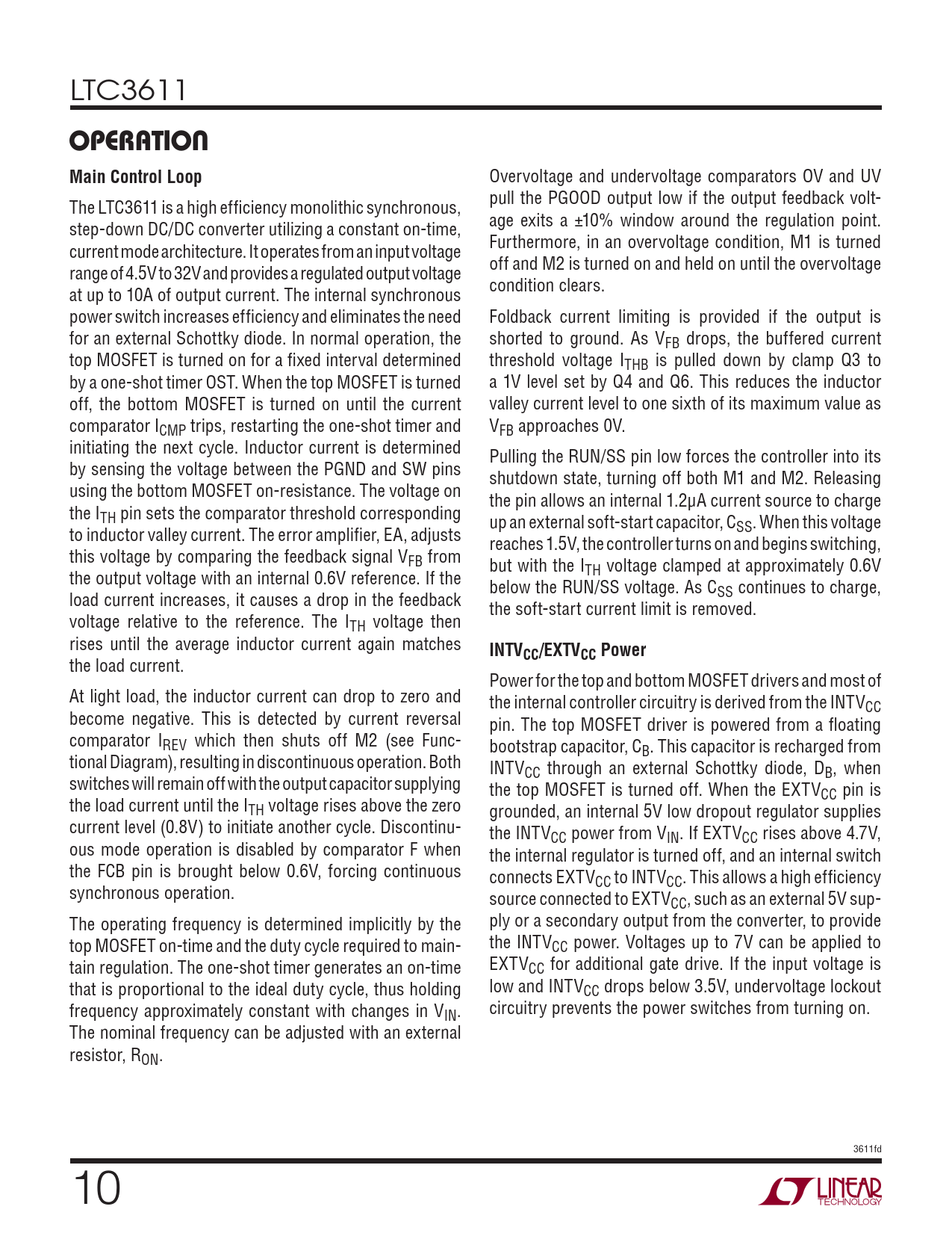 LTC3611 operAtion Main Control Loop Overvoltage and undervoltage comparators OV and UV The LTC3611 is a high efficiency monolithic synchronous, pull the PGOOD output low if the output feedback volt- step-down DC/DC converter utilizing a constant on-time, age exits a ±10% window around the regulation point. current mode architecture. It operates from an input voltage Furthermore, in an overvoltage condition, M1 is turned range of 4.5V to 32V and provides a regulated output voltage off and M2 is turned on and held on until the overvoltage at up to 10A of output current. The internal synchronous condition clears. power switch increases efficiency and eliminates the need Foldback current limiting is provided if the output is for an external Schottky diode. In normal operation, the shorted to ground. As VFB drops, the buffered current top MOSFET is turned on for a fixed interval determined threshold voltage ITHB is pul ed down by clamp Q3 to by a one-shot timer OST. When the top MOSFET is turned a 1V level set by Q4 and Q6. This reduces the inductor off, the bottom MOSFET is turned on until the current val ey current level to one sixth of its maximum value as comparator ICMP trips, restarting the one-shot timer and VFB approaches 0V. initiating the next cycle. Inductor current is determined Pul ing the RUN/SS pin low forces the control er into its by sensing the voltage between the PGND and SW pins shutdown state, turning off both M1 and M2. Releasing using the bottom MOSFET on-resistance. The voltage on the pin al ows an internal 1.2μA current source to charge the ITH pin sets the comparator threshold corresponding up an external soft-start capacitor, C to inductor val ey current. The error amplifier, EA, adjusts SS. When this voltage reaches 1.5V, the control er turns on and begins switching, this voltage by comparing the feedback signal VFB from but with the I the output voltage with an internal 0.6V reference. If the TH voltage clamped at approximately 0.6V below the RUN/SS voltage. As C load current increases, it causes a drop in the feedback SS continues to charge, the soft-start current limit is removed. voltage relative to the reference. The ITH voltage then rises until the average inductor current again matches INTV the load current. CC/EXTVCC Power Power for the top and bottom MOSFET drivers and most of At light load, the inductor current can drop to zero and the internal control er circuitry is derived from the INTV become negative. This is detected by current reversal CC pin. The top MOSFET driver is powered from a floating comparator IREV which then shuts off M2 (see Func- bootstrap capacitor, C tional Diagram), resulting in discontinuous operation. Both B. This capacitor is recharged from INTV switches wil remain off with the output capacitor supplying CC through an external Schottky diode, DB, when the top MOSFET is turned off. When the EXTV the load current until the I CC pin is TH voltage rises above the zero grounded, an internal 5V low dropout regulator supplies current level (0.8V) to initiate another cycle. Discontinu- the INTV ous mode operation is disabled by comparator F when CC power from VIN. If EXTVCC rises above 4.7V, the internal regulator is turned off, and an internal switch the FCB pin is brought below 0.6V, forcing continuous connects EXTV synchronous operation. CC to INTVCC. This al ows a high efficiency source connected to EXTVCC, such as an external 5V sup- The operating frequency is determined implicitly by the ply or a secondary output from the converter, to provide top MOSFET on-time and the duty cycle required to main- the INTVCC power. Voltages up to 7V can be applied to tain regulation. The one-shot timer generates an on-time EXTVCC for additional gate drive. If the input voltage is that is proportional to the ideal duty cycle, thus holding low and INTVCC drops below 3.5V, undervoltage lockout frequency approximately constant with changes in VIN. circuitry prevents the power switches from turning on. The nominal frequency can be adjusted with an external resistor, RON. 3611fd 0 Document Outline Features Applications Description Typical Application Absolute Maximum Ratings Pin Configuration order information Electrical Characteristics Typical Performance Characteristics Pin Functions Functional Diagram Operation Applications Information Typical Applications Package Description Revision History Typical Application Related Parts