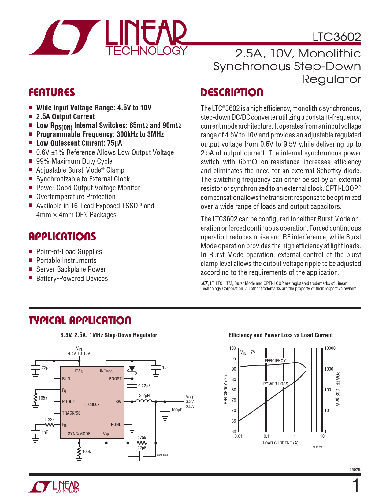 LTC3602 2.5A, 10V, Monolithic Synchronous Step-Down Regulator FEATURESDESCRIPTION n Wide Input Voltage Range: 4.5V to 10V The LTC®3602 is a high effi ciency, monolithic synchronous, n 2.5A Output Current step-down DC/DC converter utilizing a constant-frequency, n Low RDS(ON) Internal Switches: 65m Ω and 90m Ω current mode architecture. It operates from an input voltage n Programmable Frequency: 300kHz to 3MHz range of 4.5V to 10V and provides an adjustable regulated n Low Quiescent Current: 75μA output voltage from 0.6V to 9.5V while delivering up to n 0.6V ±1% Reference Allows Low Output Voltage 2.5A of output current. The internal synchronous power n 99% Maximum Duty Cycle switch with 65mΩ on-resistance increases effi ciency n Adjustable Burst Mode® Clamp and eliminates the need for an external Schottky diode. n Synchronizable to External Clock The switching frequency can either be set by an external n Power Good Output Voltage Monitor resistor or synchronized to an external clock. OPTI-LOOP® n Overtemperature Protection compensation allows the transient response to be optimized n Available in 16-Lead Exposed TSSOP and over a wide range of loads and output capacitors. 4mm × 4mm QFN Packages The LTC3602 can be confi gured for either Burst Mode op- eration or forced continuous operation. Forced continuous APPLICATIONS operation reduces noise and RF interference, while Burst Mode operation provides the high effi ciency at light loads. n Point-of-Load Supplies In Burst Mode operation, external control of the burst n Portable Instruments clamp level allows the output voltage ripple to be adjusted n Server Backplane Power according to the requirements of the application. n Battery-Powered Devices , LT, LTC, LTM, Burst Mode and OPTI-LOOP are registered trademarks of Linear Technology Corporation. All other trademarks are the property of their respective owners. TYPICAL APPLICATION3.3V, 2.5A, 1MHz Step-Down RegulatorEffi ciency and Power Loss vs Load Current VIN 100 10000 4.5V TO 10V VIN = 7V 95 EFFICIENCY 22μF 1μF PV 90 1000 POWER LOSS (mW) IN INTVCC RUN BOOST 85 0.22μF POWER LOSS RT 80 100 2.2μH 105k VOUT PGOOD SW 3.3V 75 LTC3602 EFFICIENCY (%) 2.5A 100μF 70 10 TRACK/SS 4.32k 65 ITH PGND 1nF SYNC/MODE V 60 1 FB 475k 0.01 0.1 1 10 LOAD CURRENT (A) 22pF 3602 TA01b 105k 3602 TA01 3602fb 1
