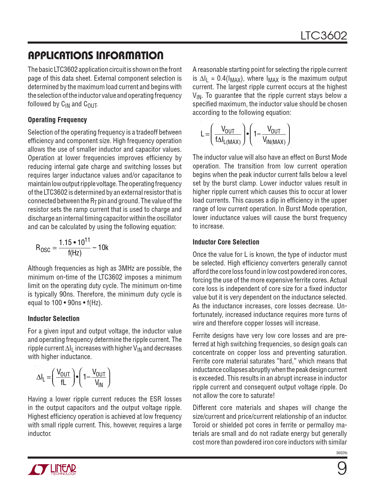 APPLICATIONS INFORMATION Operating Frequency Inductor Core Selection Inductor Selection