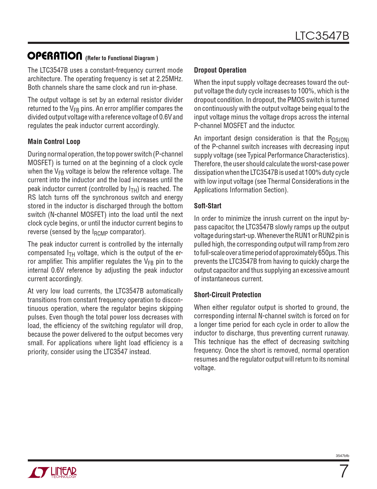 DS(ON) of the P-channel switch increases with decreasing input During normal operation, the top power switch (P-channel supply voltage (see Typical Performance Characteristics). MOSFET) is turned on at the beginning of a clock cycle Therefore, the user should calculate the worst-case power when the VFB voltage is below the reference voltage. The dissipation when the LTC3547B is used at 100% duty cycle current into the inductor and the load increases until the with low input voltage (see Thermal Considerations in the peak inductor current (controlled by ITH) is reached. The Applications Information Section). RS latch turns off the synchronous switch and energy stored in the inductor is discharged through the bottom