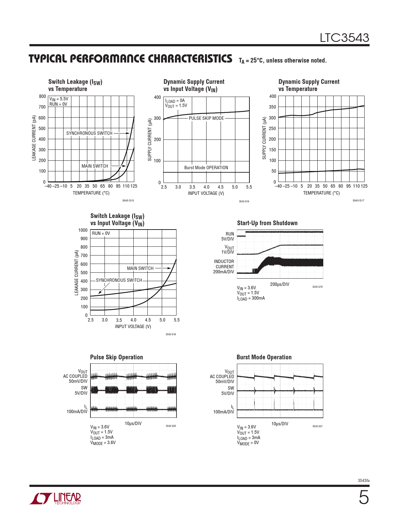 1000 RUN = 0V RUN 900 5V/DIV 800 VOUT 1V/DIV 700 INDUCTOR 600 MAIN SWITCH CURRENT 500 200mA/DIV 400 SYNCHRONOUS SWITCH 200μs/DIV 3543 G19 300 VIN = 3.6V LEAKAGE CURRENT (pA) VOUT = 1.5V 200 ILOAD = 300mA 100 0 2.5 3.0 3.5 4.0 4.5 5.0 5.5 INPUT VOLTAGE (V) 3543 G18