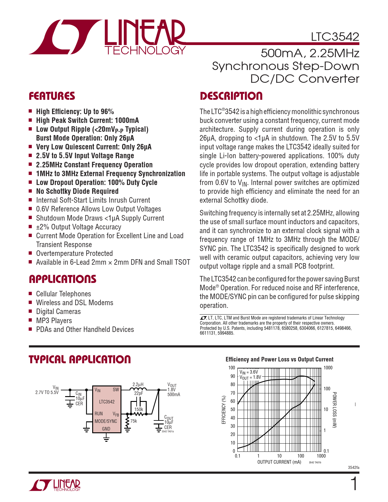 100 1000 VIN = 3.6V 90 VOUT = 1.8V 2.2μH V 80 V OUT IN V 100 IN SW 1.8V 2.7V TO 5.5V POWER LOSS (mW) C 22pF IN 500mA 70 10μF LTC3542 60 CER 150k 50 10 RUN VFB COUT 40 MODE/SYNC 75k 10μF EFFICIENCY (%) CER 30 GND 3542 TA01a 1 20 10 0 0.1 0.1 1 10 100 1000 OUTPUT CURRENT (mA) 3542 TA01b 3542fa 1