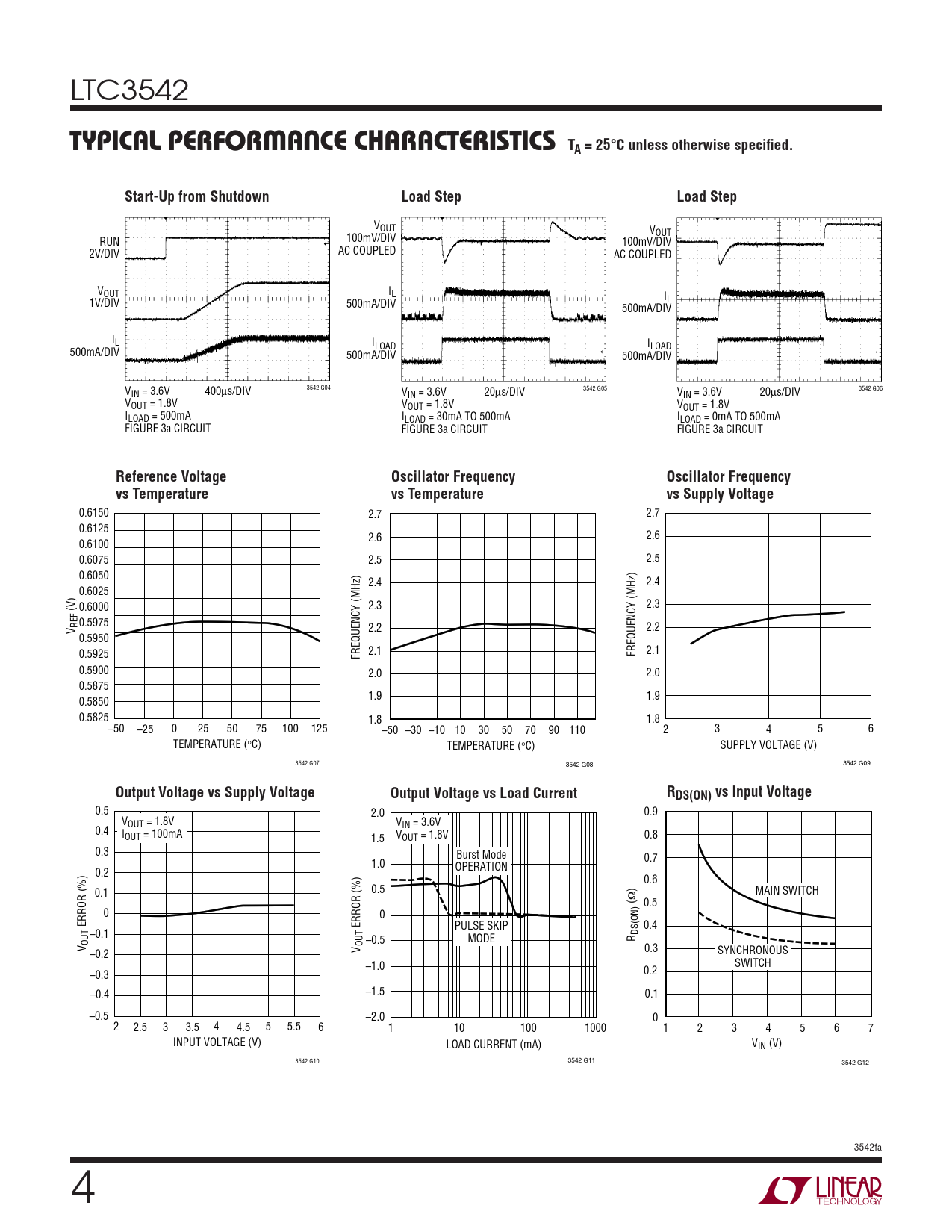 VOUT VOUT RUN 100mV/DIV 100mV/DIV 2V/DIV AC COUPLED AC COUPLED VOUT IL I 1V/DIV 500mA/DIV L 500mA/DIV IL ILOAD ILOAD 500mA/DIV 500mA/DIV 500mA/DIV VIN = 3.6V 400μs/DIV 3542 G04 VIN = 3.6V 20μs/DIV 3542 G05 VIN = 3.6V 20μs/DIV 3542 G06 VOUT = 1.8V VOUT = 1.8V VOUT = 1.8V ILOAD = 500mA ILOAD = 30mA TO 500mA ILOAD = 0mA TO 500mA FIGURE 3a CIRCUIT FIGURE 3a CIRCUIT FIGURE 3a CIRCUIT